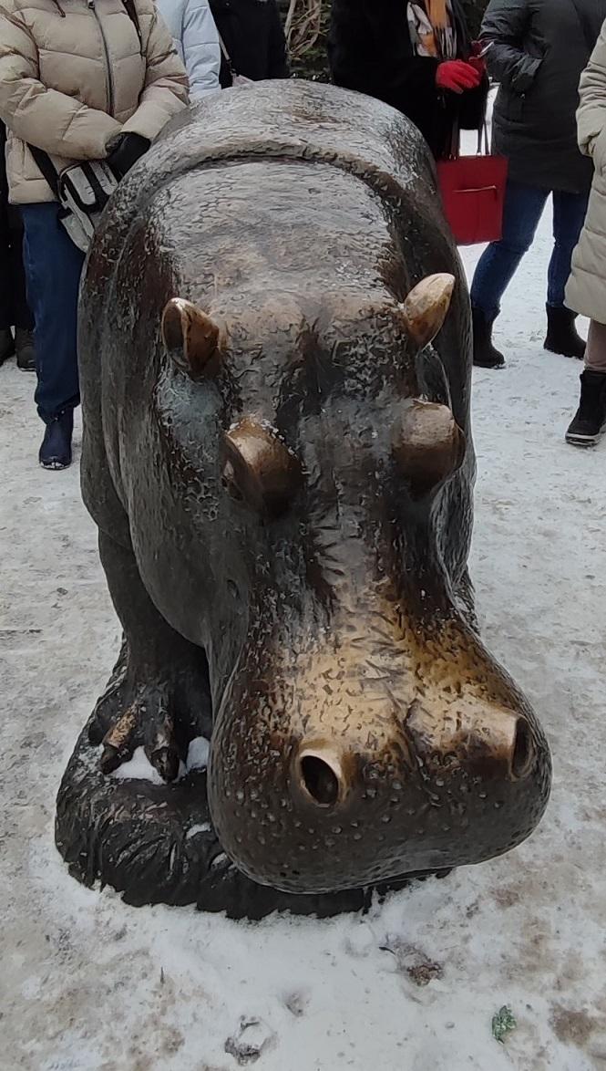 Не секрет, что гулливерский Петр Первый в исполнении знаменитого, хоть и не всеми любимого скульптора Зураба Церетели, вызвал очень много жарких споров и отторжений. Обвиняемый в склонности в гигантомании скульптор обиделся и сказал, что следующую скульптуру он изваяет в минималистичной манере. И начал вести переговоры с нашим городом о создании памятника Сталину. Но время для массовой установки памятников великому тирану (как это происходит сейчас) еще не пришло тогда, и в какой-то момент замысел каким-то образом от Сталина свернул к вот этому милому животному. Несмотря на солидный вес скульптуры – 700 кг- это и в самом деле миниатюра, ведь в природе вес бегемота может доходить до 4 тонн!!! Это самцы, самки же весят много меньше – полторы-две тонны, но и это больше бронзового бегемотика. Мне лично творчество Церетели вовсе не близко – на мой вкус его скульптурам не достаёт классического изящества и тонкости в деталях. Но вот бронзовый бегемот, как ни парадоксально, получился очень изящным и реалистичным, насколько я могу судить по зоопарковым особям. Появилась эта бронзовая зверюшка в 2008 году; если верить источникам, совершенно бесплатно для города – как подарок Церетели волгоградской детворе. Рядом расположился торгово-развлекательный центр с ожидаемым названием Гиппопо. У бегемотика ярко сияют ушки: как и у многих схожих городских арт-объектов, у него тоже есть поверье про "потереть – исполнить желание". Бегемот и гиппопотам – синонимы, это просто разное название из разных языков. Привычнее и роднее из детства конечно же – бегемот. Но вот перевод! Оказывается, в переводе с древнееврейского языка "бегемот" это просто – "скотина"! А вот "гиппопотам" – это "речная лошадь" по-гречески. Впервые греки услышали незнакомое и невидимое под водой в реке Нил животное, издающим фырканье и ржание совсем по-лошадиному – вот так и прозвали….