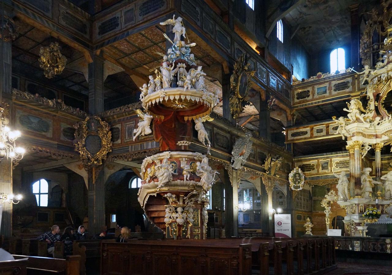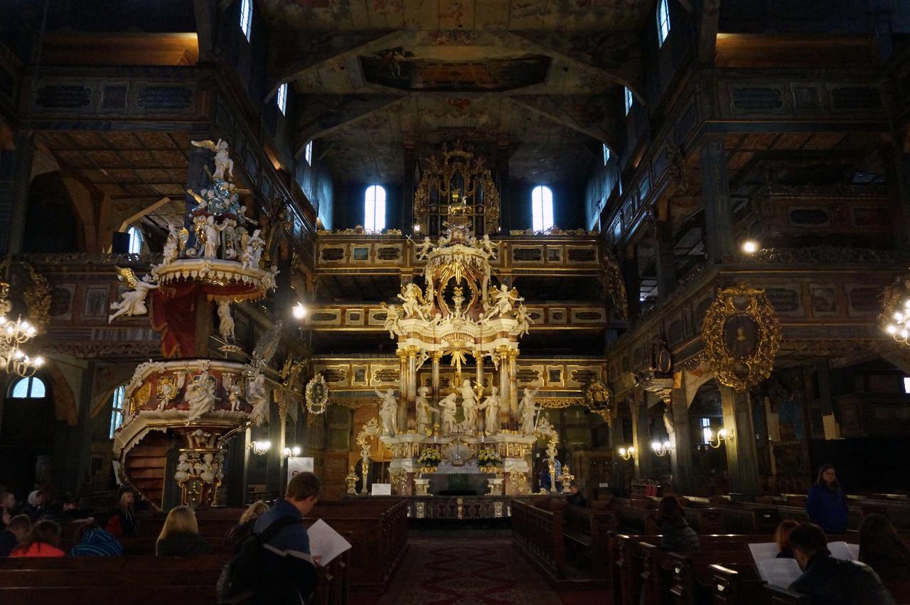 Своды центрального нефа, а также боковых нефов и трансепта, ограждения галерей, облицованные деревом стены и квадратные колонны, покрыты росписью и обрамлены резьбой. Великолепие и красоту храма подчёркивают построенные несколько позже ложи, а также гербовые и цеховые щиты и эпитафии на ограждениях галерей.