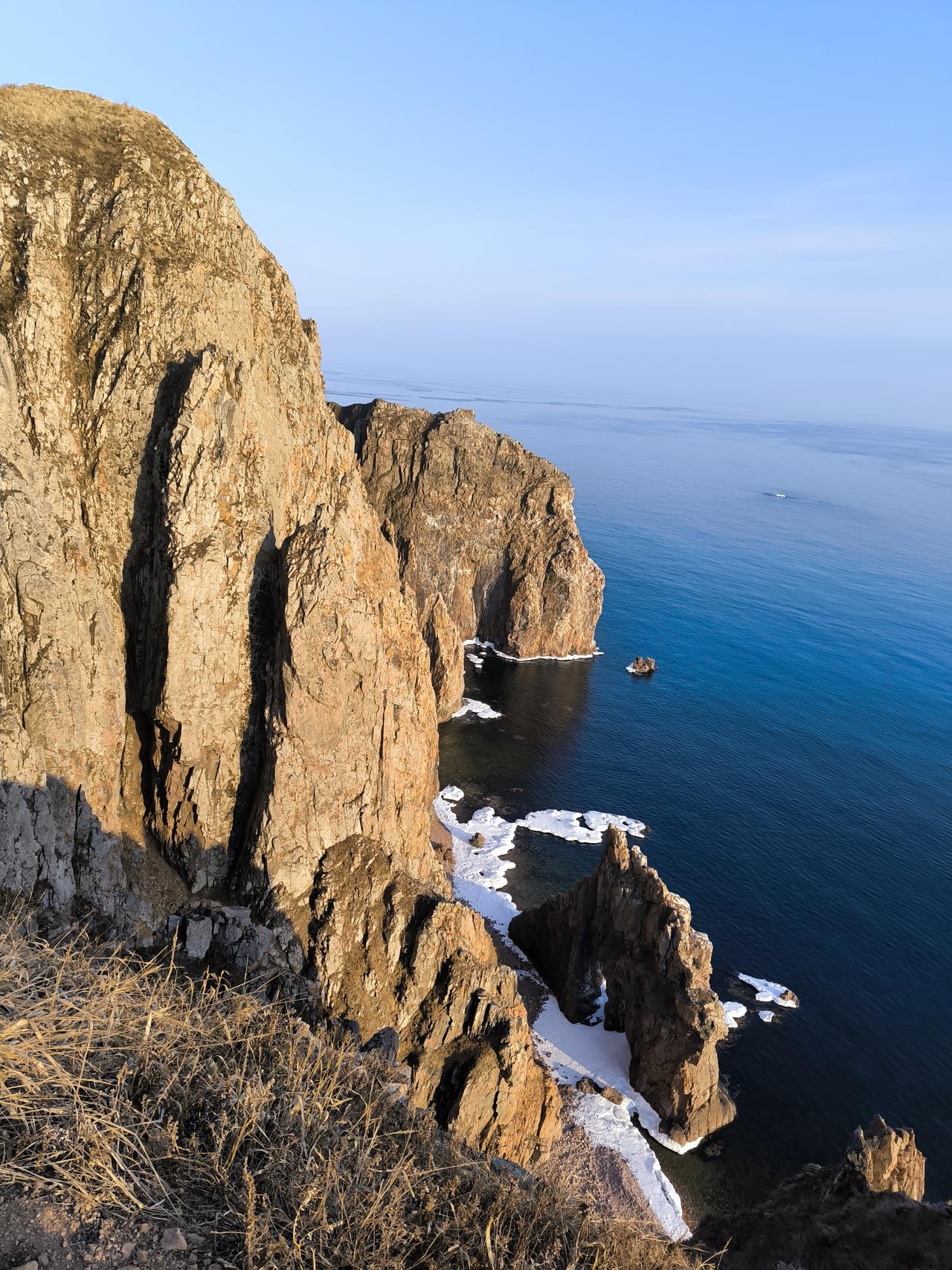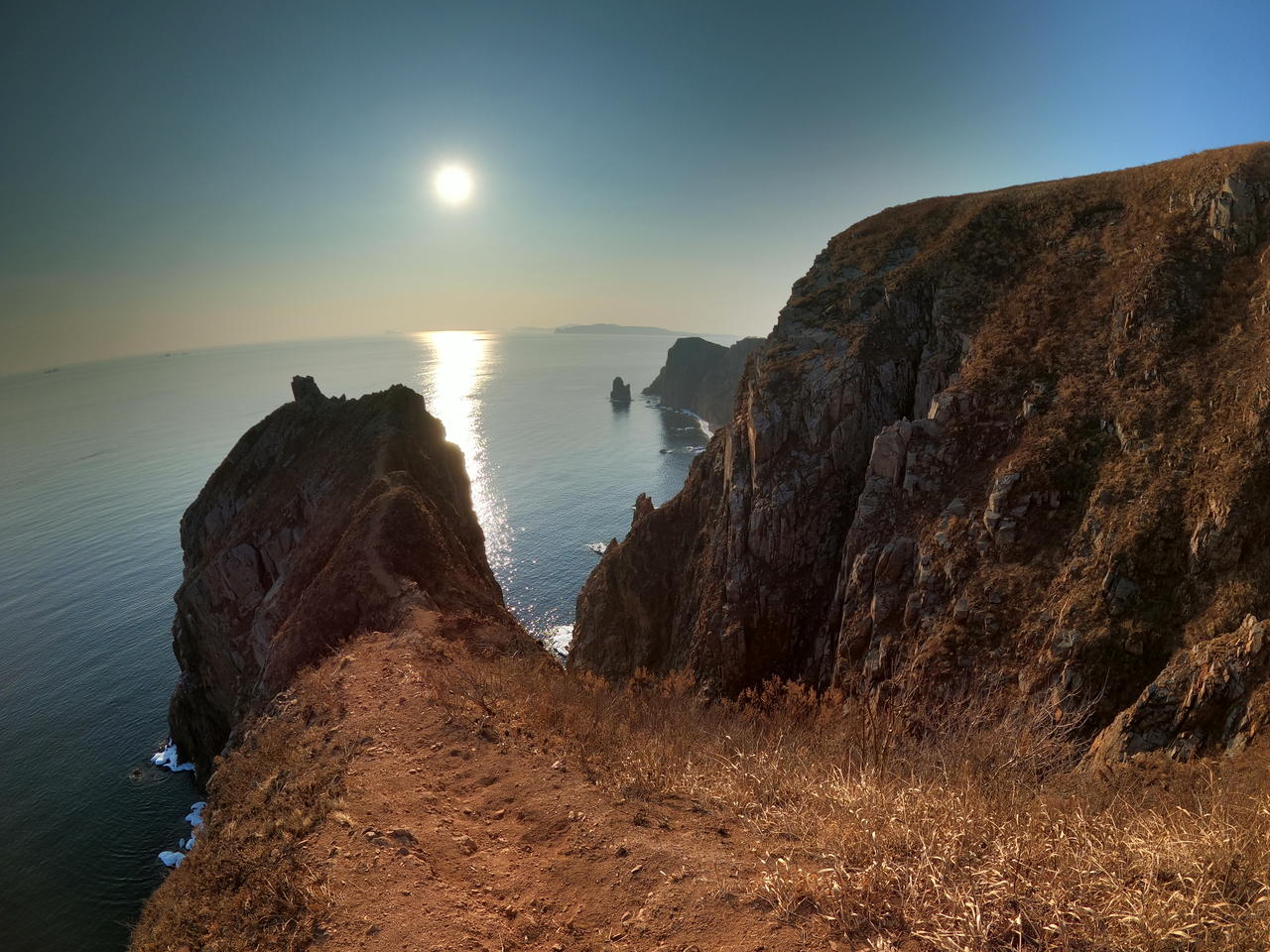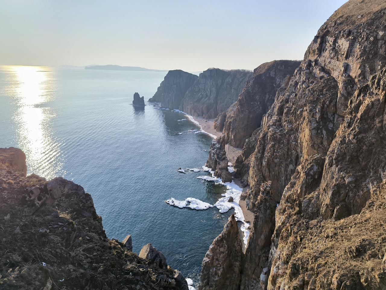 Остров Шкота связан косой с островом Русский. Коса составляет в ширину примерно 2-3 метра, а в длину около 1 км. Во время прилива коса полностью скрывается под водой. Если вы попали именно в такую ситуацию, то глубина здесь составляет около 0.5 м. С другой стороны остров Шкота обрывистый, скалистые берега открывают прекрасный вид на архипелаг императрицы Евгении. Кроме того, Вы можете спуститься вниз по канатной лестнице на побережье. Здесь впечатлений достанется каждому и от крутого спуска, и от живописной галечной бухты внизу. На острове Шкота есть старый маяк. Возле него можно сделать много хороших снимком на память.