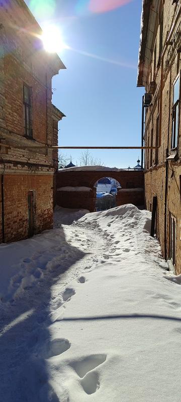 Посмотреть, как выглядел Хлыновский деревянный кремль, можно в Краеведческом музее – там есть экспонат-макет. А вот арку – хотя и нелегко ее найти – рекомендую посетить, но только непременно днем. Во-первых – в сумерках в эти темные дворы и соваться-то боязно. Да и непонятно куда идти – хотя табличка есть. Мы ее увидели как раз вечером – но так и не поняли, куда же идти. Поэтому на экскурсии следующим утром увлекли туда всю нашу группу во главе с экскурсоводом. И это была лучшая смотровая площадка и место для фото, откуда виден как на ладони Трифоновский монастырь.
