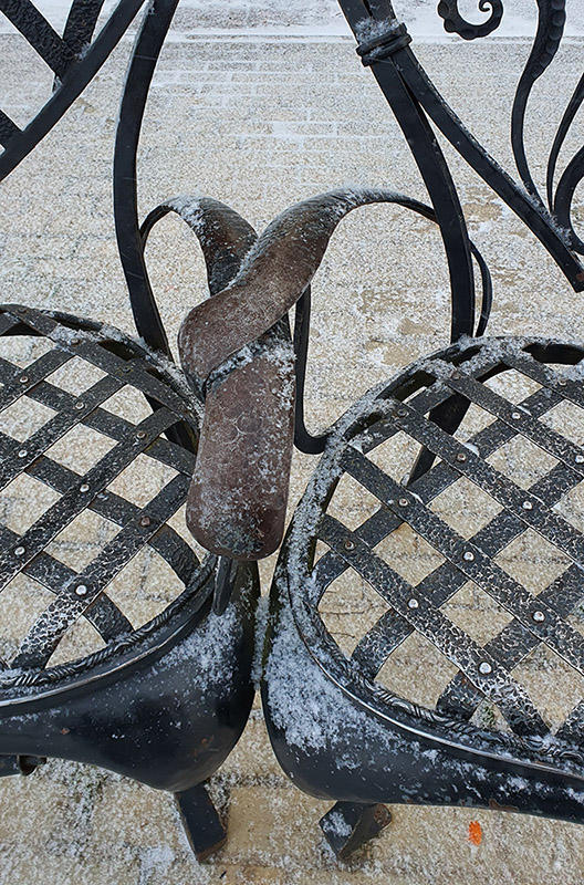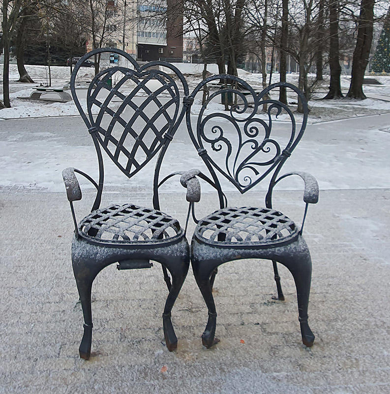 Кованый памятник, посвященный влюбленным, представляет собой два «влюблённых кресла», которые сами отчасти похожи на людей. Женское - более декорированное, мужское - более брутальное. У кресел переплетены подлокотники, они как бы прильнули друг к другу, сидя под руку. Так что даже без людей кресла выглядят как законченная композиция - как два «влюблённых кресла».