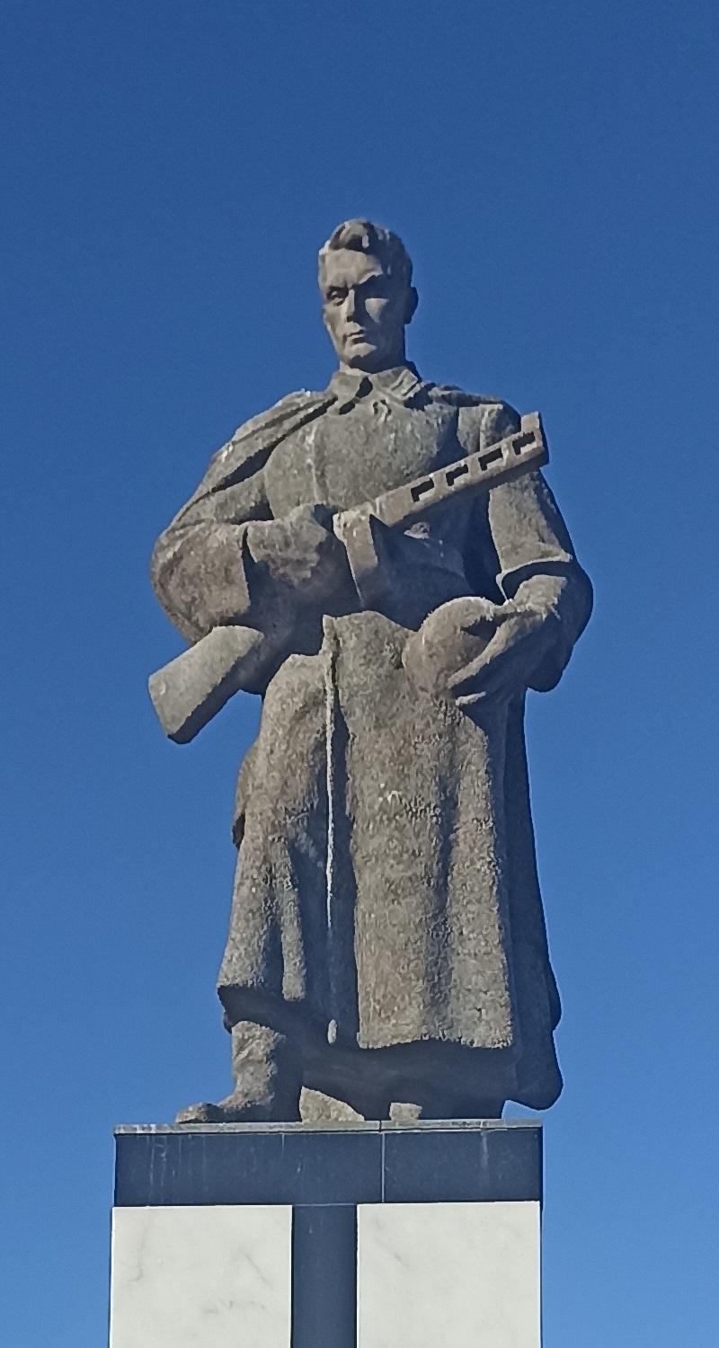 К празднованию 10-летия победы в Сталинградской битве в 1954 г.на месте братской могилы был установлен памятник в виде солдата, по проекту архитектора Б. А.Измоденова. На надгробной плите имена 39 захороненных воинов из тех 2000, чьи имена установлены. Изначально воин стоял лицом к ДК, позже его развернули спиной к дворцу культуры. в 1976 г. по проекту архитекторов М. Д. Голубина и А. И. Баринова облицован гранитными плитами. Отреставрирован - в 1987 г. по проекту архитектора Г. М. Камышева.