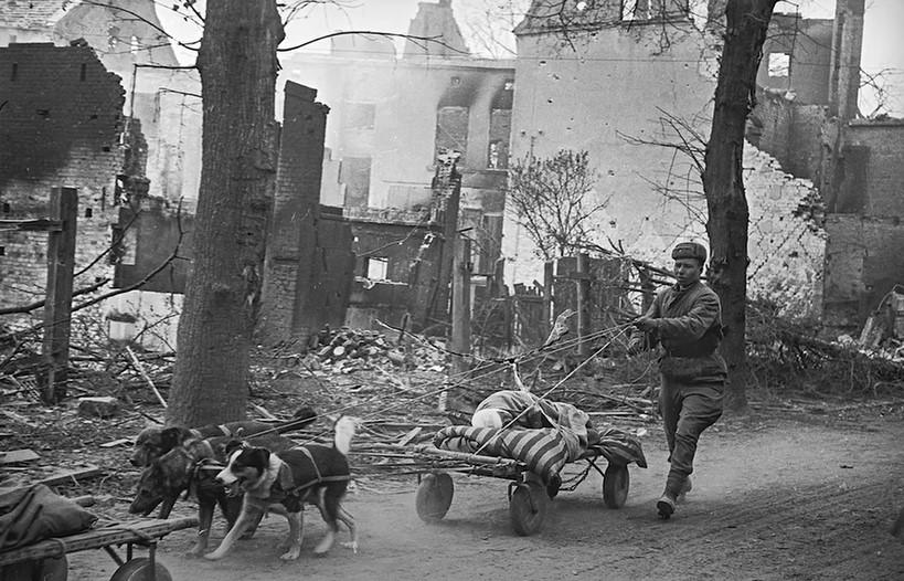 Использовали собак и как тяговую силу – привязывали к ним санки-волокуши и вывозили раненых с поля боя в медсанбат. Но иногда судьба друзей человека была трагичной. Они могли работать не только санитарами, но и подрывниками, что для них было смертельной миссией. Собаке в сумку могли положить не медикаменты, а взрывчатку. Обвешенная ею собака забегала под танк врага и взрывалась там.