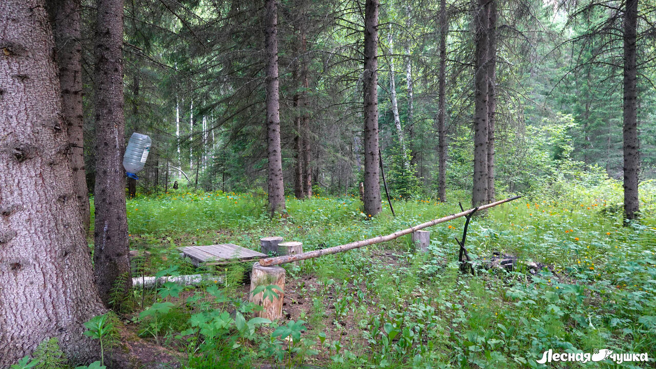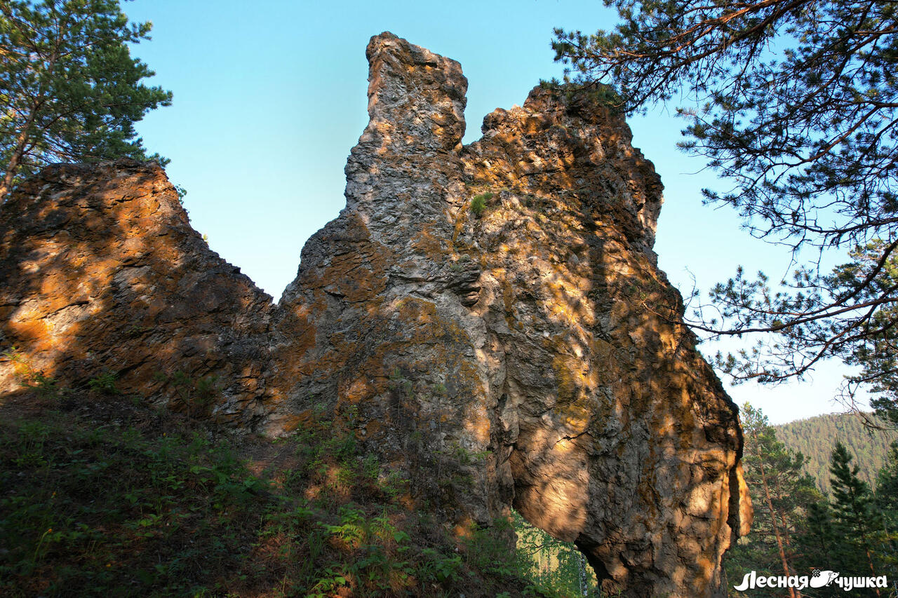 На Торгашинском хребте есть удивительно атмосферное место. Труднодоступное и, пожалуй, этим особенно привлекательное. Две большие поляны на берегу Базаихи, живописный лес и скала Верблюд. Действительно, останец очень напоминает это животное: есть горб, шея, сквозная арка, разделяющая «ноги». Весь комплекс скал называется Ближние Верблюды.