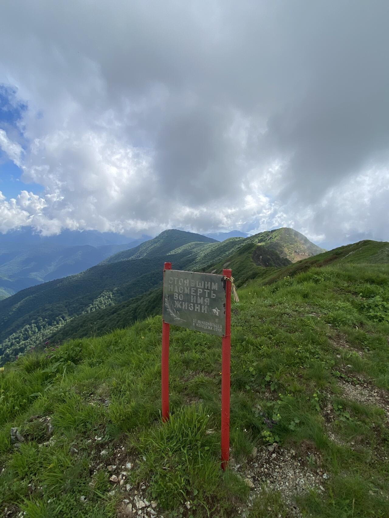 Ну а на вершине – все гораздо проще и красивее. Преодолев крутой участок тропы вы попадаете даже не на пик, а на довольно широкий гребень Маврикошки, покрытый альпийской травой. Здесь же установлен памятный знак, посвященный защитникам Кавказа в годы Великой отечественной войны. С вершины открываются панорамные виды на все 360 градусов. Тут и южные отвесные отроги Фишта, и база на «Лунной поляне», и пастушьи балаганы с высоты птичьего полета, и Черкесский перевал, и продолжение «тридцатки», устремляющейся к «Веселому спуску». Маленькими бонусами служат появляющаяся на вершине Маврикошки сотовая связь и, в зависимости от сезона, кустики черники, усыпанные сладкими ягодами.