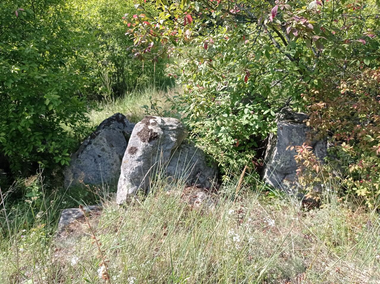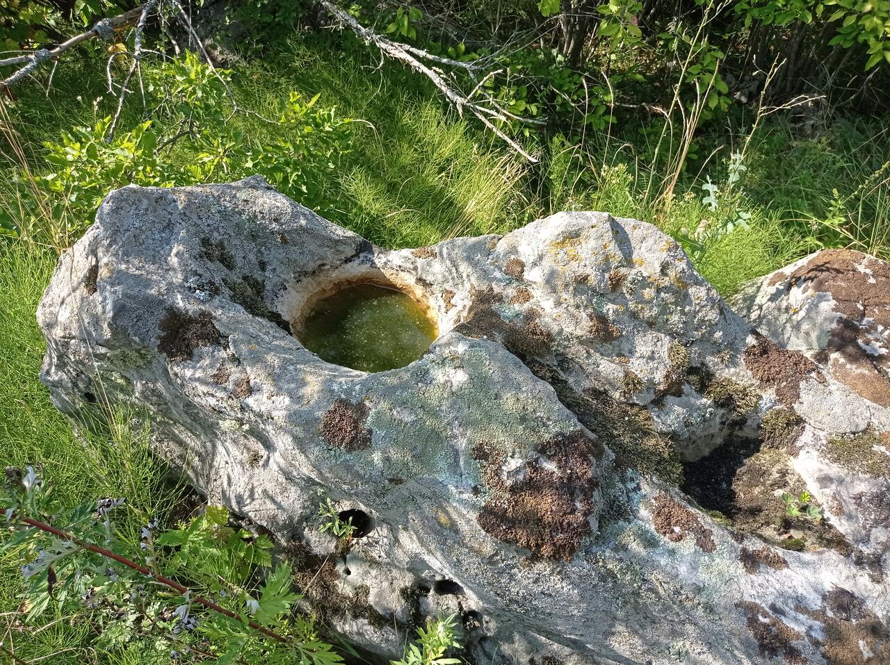 Один камень - с каменной чашей. наполненной водой, напомнил ритуальные жертвенники. Но вода в жаокий день спасает насекомых. Мы пить не стали. Вдруг "козленочками станем" или бобрами? Откуда то они появились в этих местах.