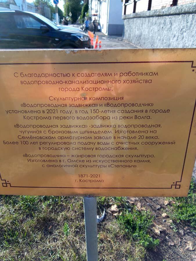 Хоть в Костроме давно уже стояла «Водопроводная задвижка» с бронзовым шпинделем. Задвижка была изготовлена в начале ХХ века в Нижегородской губернии на Семеновском литейном заводе и больше 100 лет регулировала подачу воды, но хотелось оживить композицию. Поэтому рядом с задвижкой появился собирательный образ добродушного мужчины средних лет, который следит за тем, чтобы в домах горожан всегда была вода, Скульптура возвышается над землёй на выложенном кирпичом постаменте напротив ворот костромского водоканала.