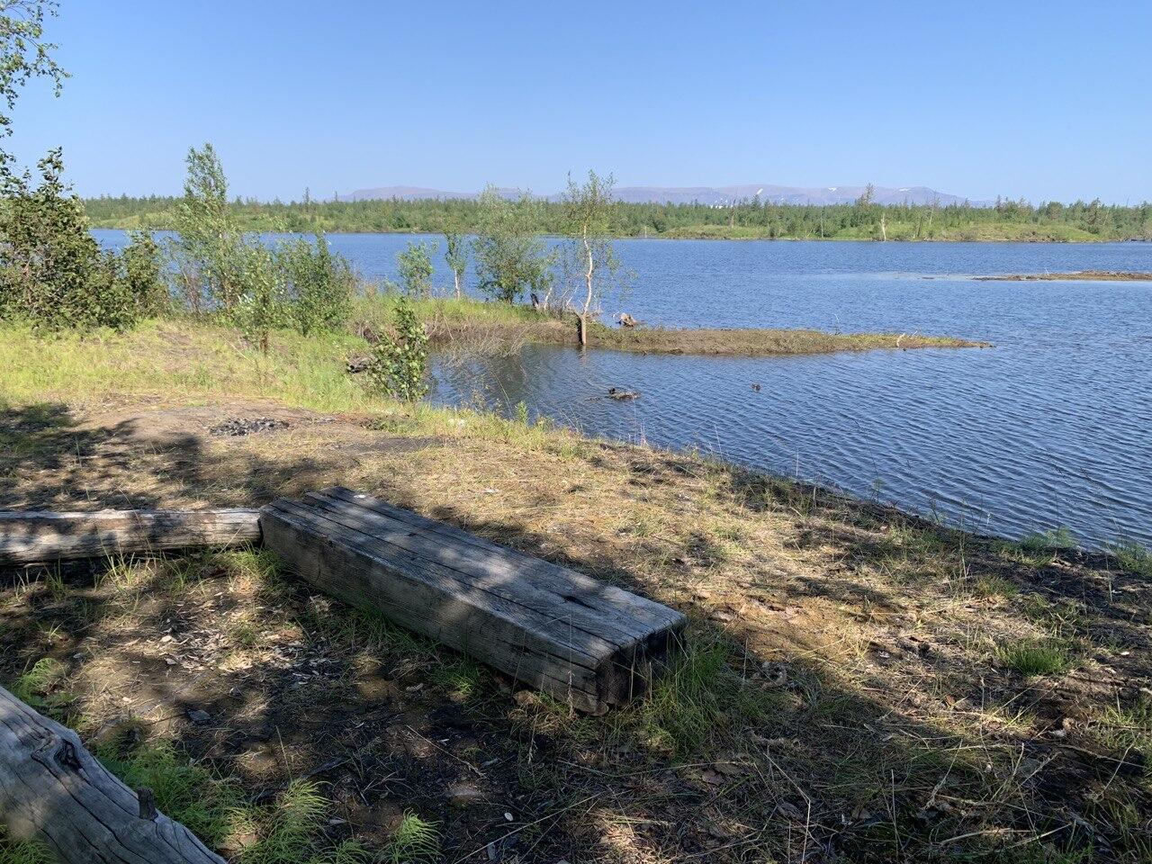 Ещё одна интересная особенность этого места - местные приезжают сюда купаться и загорать. По координатам 69.377398, 88.344582 находится небольшая деревянная палуба, на которой можно позагорать и смотреть на озеро. Правда слово "любоваться" я здесь не могу применить, но это на любителя. Видимо где-то рядом есть спуск к озеру для купания.