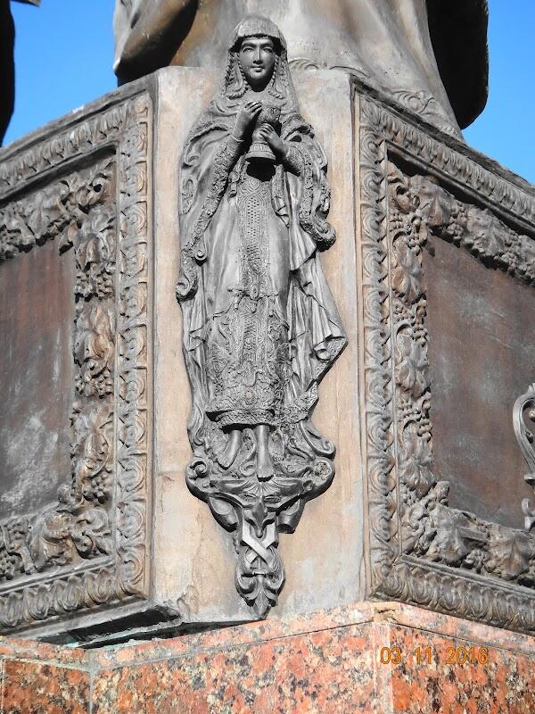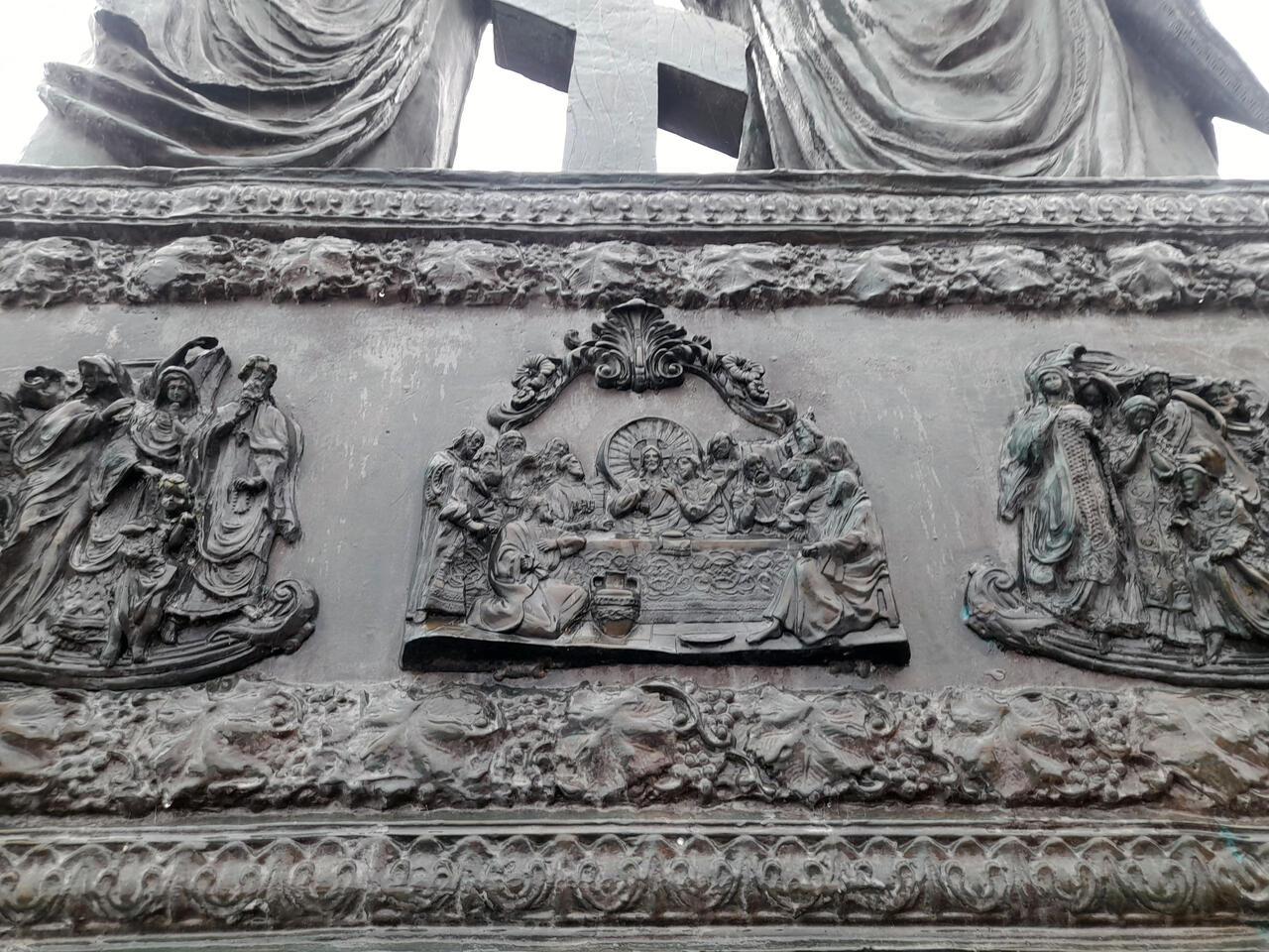 Фигуры апостолов Петра и Павла изображены в полный рост, они держат крест и указывают вперед. Шестиметровый бронзовый памятник возвышается на большом мраморном постаменте с бронзовой табличкой с именами. Выполнен он в стиле неоампир. Он установлен в хорошем месте — это центр города, с великолепным видом на вулканы, которые местные жители называют "домашними". Строгий и лаконичный памятник, посвященный святым апостолам Петру и Павлу — главный символ города и его окрестностей.