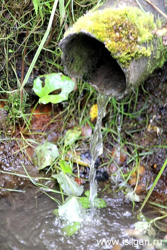 Вода вытекает из трубы небольшой струйкой, на вкус приятная и холодная. Дальше ручеек течет в заросли кустов и заболачивает местность вокруг себя. Рядом с ключом в землю воткнута палка, чтобы расчищать русло ручья от зарослей травы и листвы.