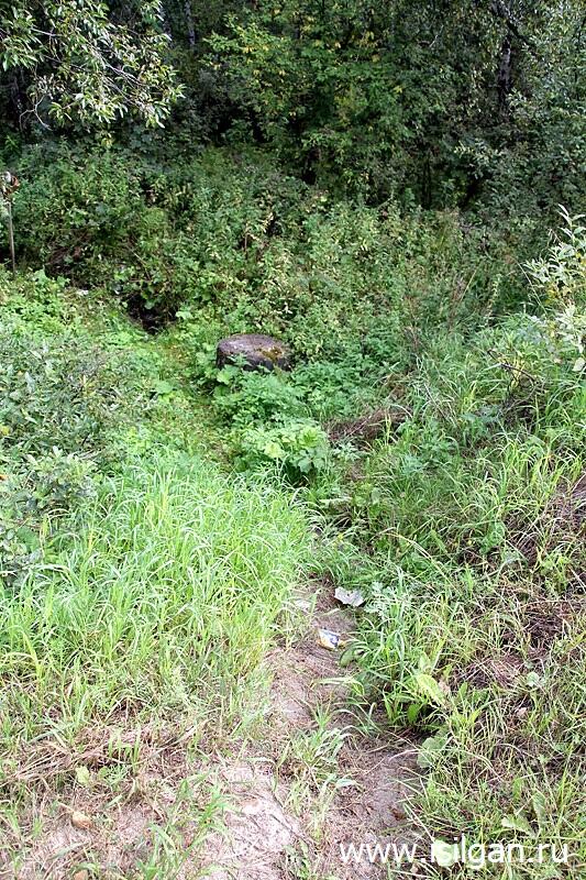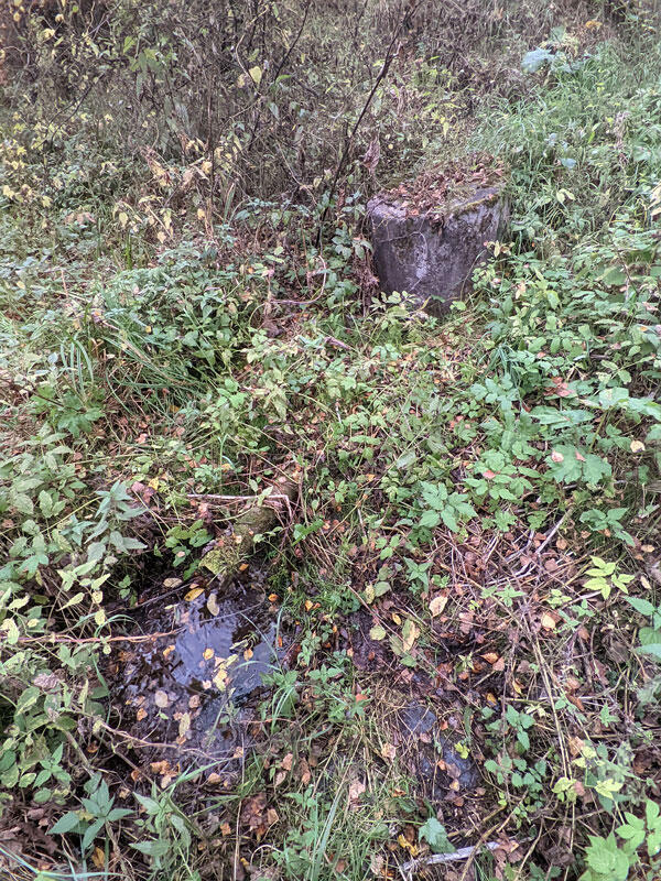 Чтобы не переходить дорогу, я шел к роднику по лесу. Популярный когда-то ключ сейчас практически не используется, так как доступа с дороги к нему нет. Местность заросла травой и кустами. Тропинки от отбойника не видно. Вода потихоньку льется из трубы. Скоро только геокэшэры будут знать, что есть такой источник.