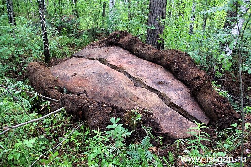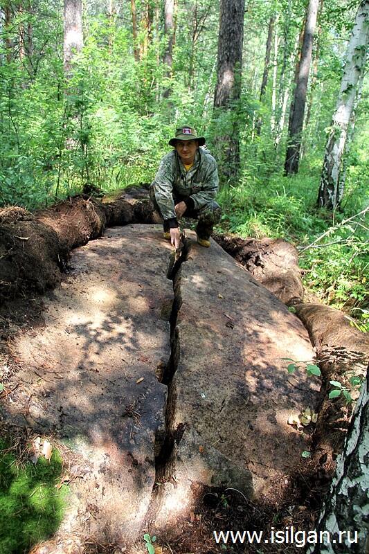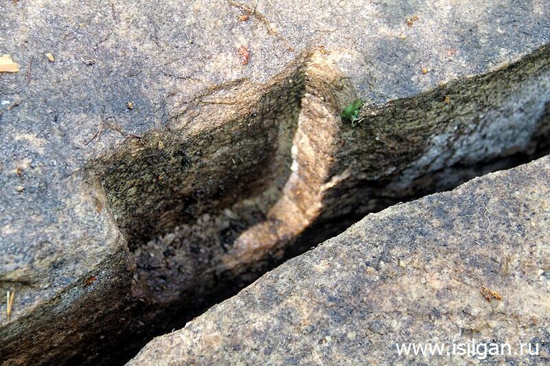 Осматривая местность вокруг Дунькиного сундука, я увидел, что под дерном находится много каменных глыб и часть из них имеет правильную геометрическую форму. Вокруг одного большого камня была хорошо заметна канавка, но не возможно было точно установить, что это дело человеческих рук. Стоя на камне, я почувствовал под ногой щель и решил снять слой дерна. Когда камень был очищен, то стала хорошо видна большая трещина, которая его делит на две части. Вдоль трещины отлично сохранились следы больших клиньев, а поверхность камня очищена от верхнего пористого слоя. У меня не осталось никакого сомнения в том, что именно в этом месте ломали камень и везли его на кыштымские заводы, чтобы использовать как фундамент для тяжелого оборудования. А Дунькин сундук, скорее всего, был выломан и обработан здесь же, но по каким-то причинам, брошен у дороги. Большая каменная глыба с расколом находится всего-то в 20 метрах от Дунькиного сундука, поэтому я и называю эту каменоломню Дунькиной.