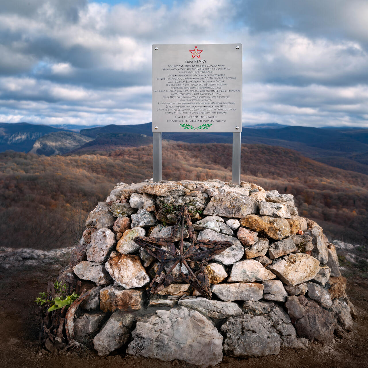 Памятный знак установлен на вершине горы Бечку, близ перевала Бечку. С горы открывается вид на все 360 градусов. Виден весь район, где действовали партизаны Севастопольского, Балаклавского, Ак-Мечетского и Сакского отрядов. На юго-востоке виден массив Орлиного Залета и Чайного Домика, на юге район Адым-Тюра, далее район Карадагского Леса, К западу, за хребтом, район Алсу, далее район Атлауса и Севастополь. Открывается вид на путь, который проделали отряды при переходе в Заповедник в марте 1942-го года. На фоне главной гряды виден Басман, куда перешли партизаны, виден Чатыр-Даг и гора Черная , где был главный штаб партизанского движения.