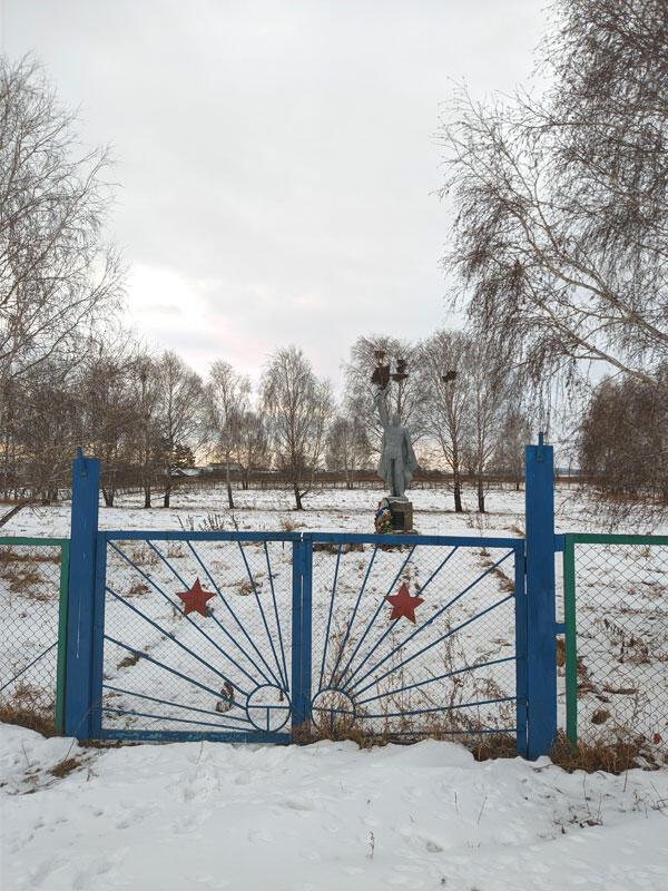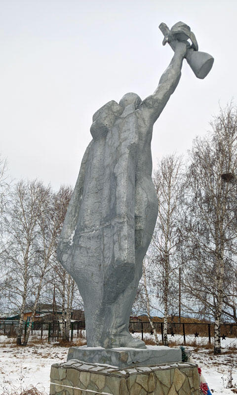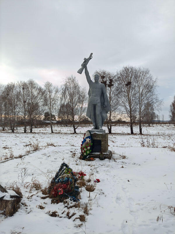 Ростовая скульптура солдата Великой Отечественной, победно поднявшего вверх свой автомат ППШ. На пьедестале укреплена табличка с мемориальной надписью и списком фамилий.