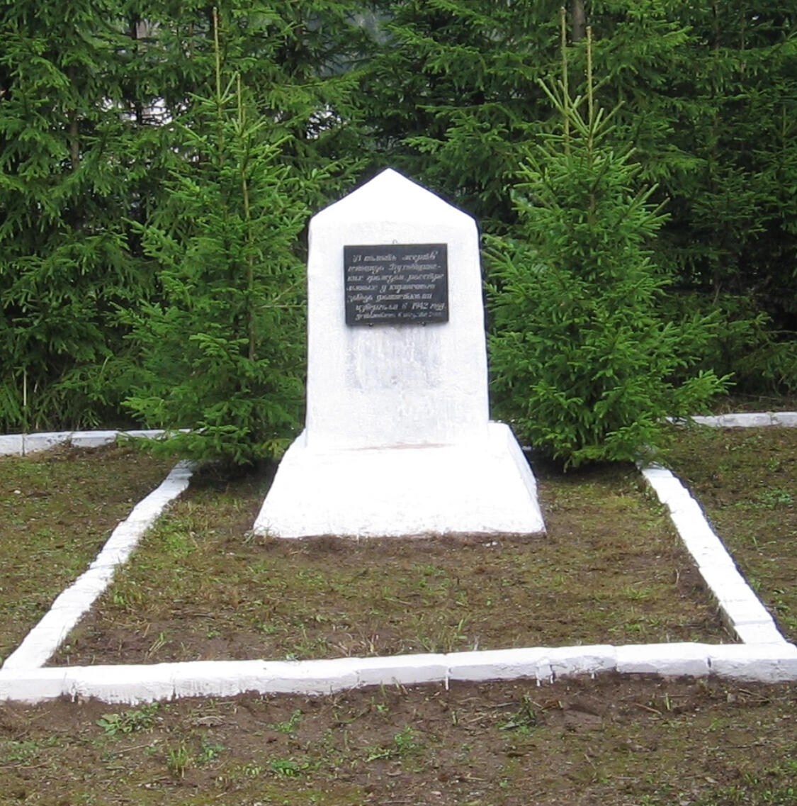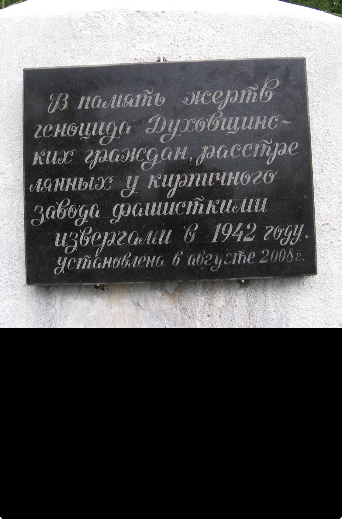 Каждая пядь духовщинской земли хранит в себе память о жестоких и страшных событиях Великой Отечественной войны. На местах былых сражений установлены памятные знаки, посвящённые воинам, геройски сражавшимся на территории города Духовщины и Духовщинского района. О трагических страницах войны напоминают нам и памятники на местах сожжённых деревень. А ещё, есть в Духовщине памятный знак, установленный на месте гибели и захоронения евреев, расстрелянных фашистами. Данный памятный знак был установлен на территории бывшего Духовщинского кирпичного завода 28 мая 1993г. На этом месте в годы Великой Отечественной войны (в 1941 и 1942гг.) фашисты и полицаи расстреливали евреев, попавших им в руки. Количество расстрелянных в Духовщине евреев точно неизвестно. В Книге Памяти мирных жителей Смоленской области говорится, что было уничтожено почти тысячное довоенное еврейское население Духовщины. А были в Духовщине ещё и евреи, привезённые со станции Ярцево.