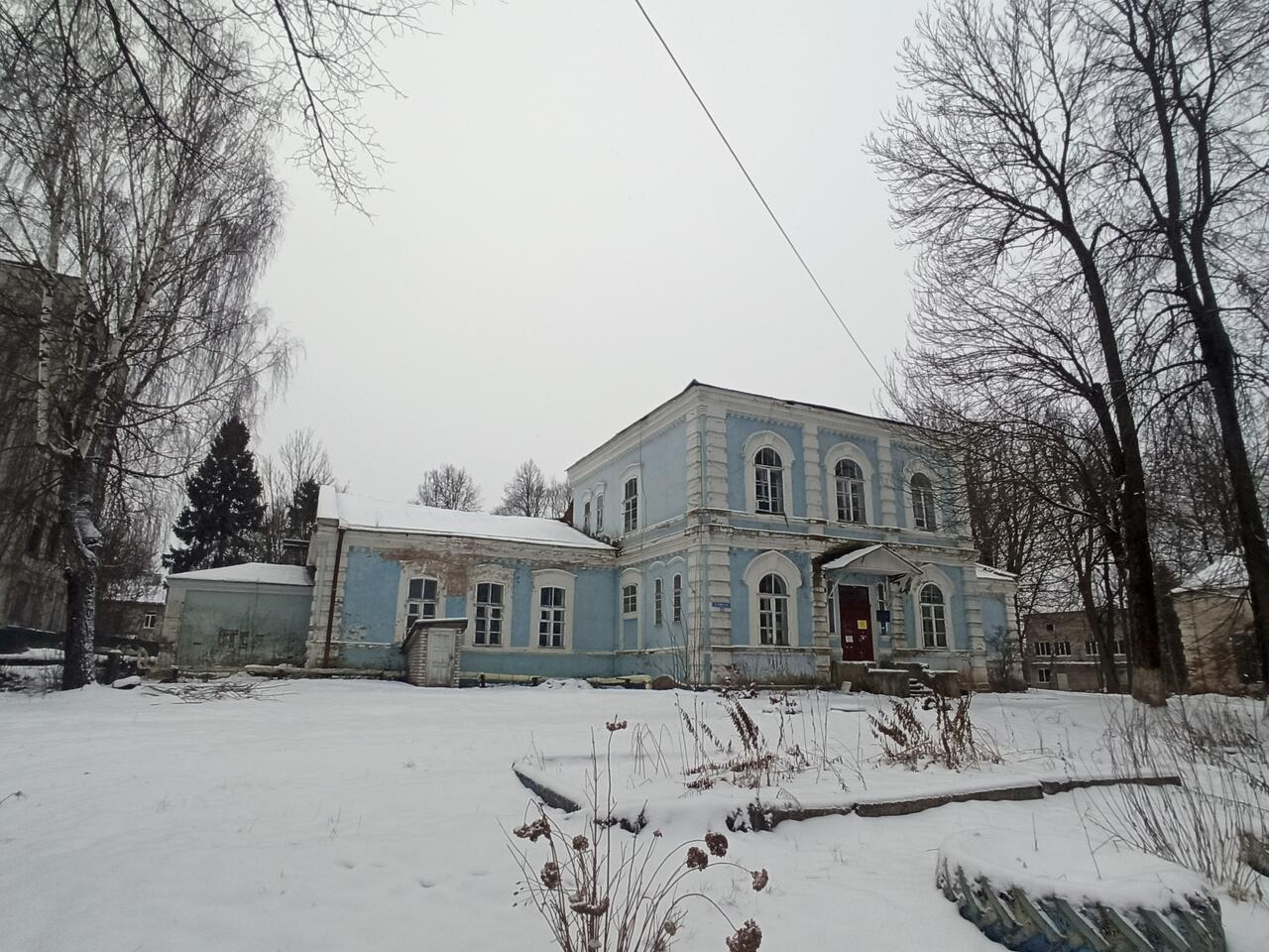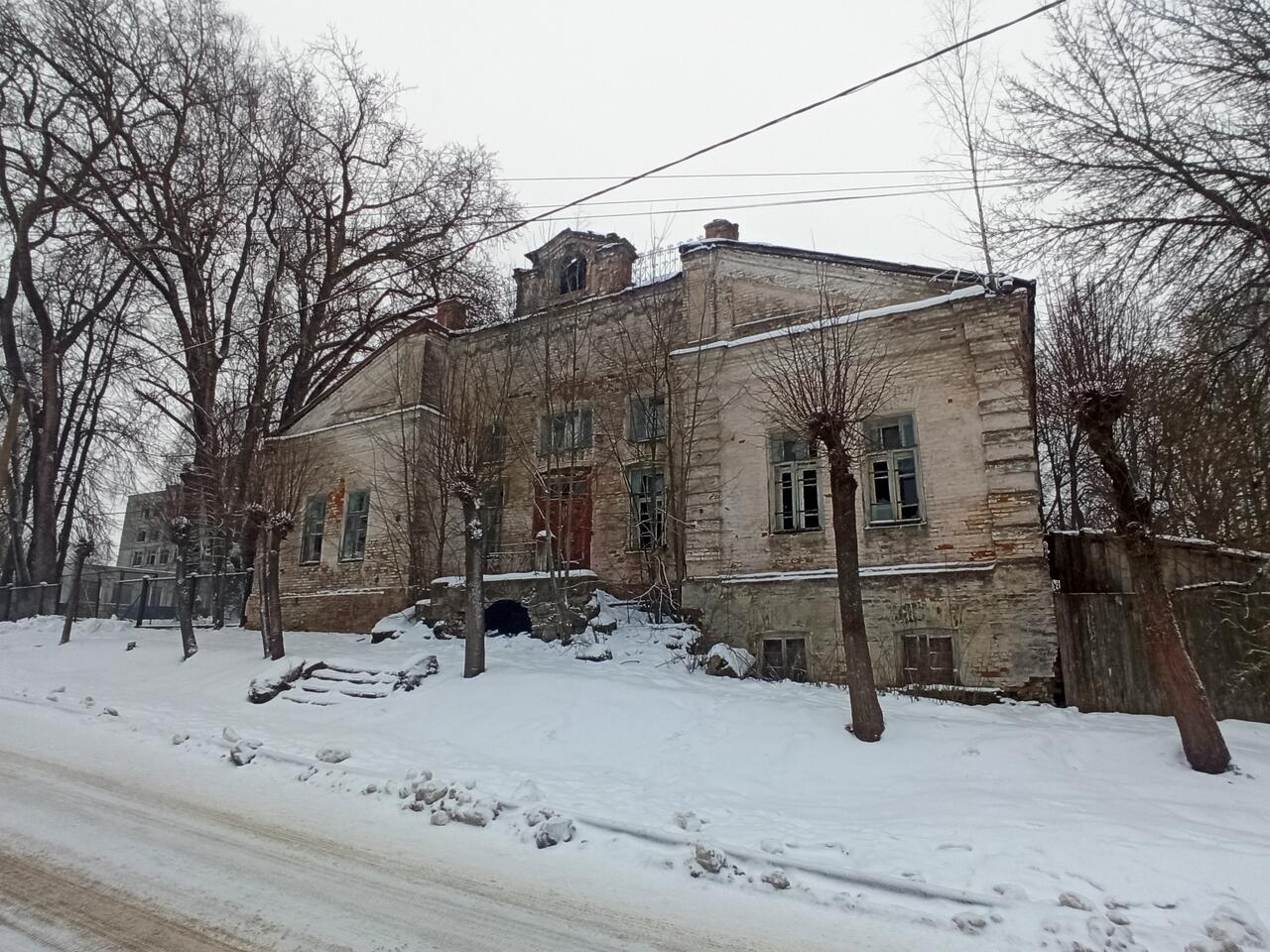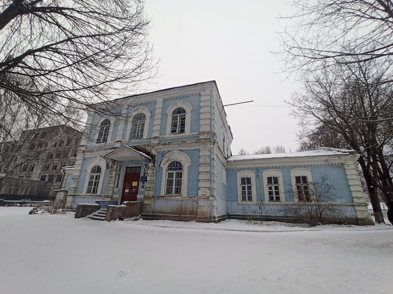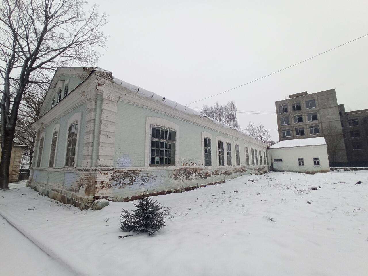 "До постройки каменных зданий эта земская больница, появившаяся в уезде к 1880 году, располагалась в трёх деревянных корпусах.