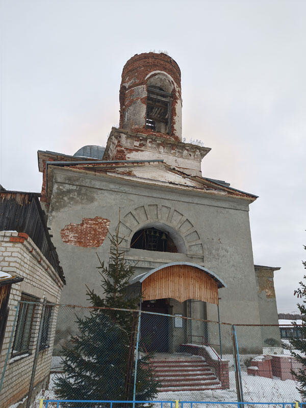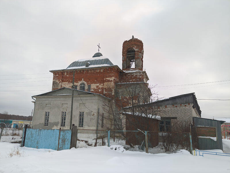 Каменная трехпрестольная церковь. Заложена 12 июня 1832 г. Правый придел, во имя свт. Василия Великого, освящен 7 февраля 1835 г. Главный храм, во имя мчч. Флора и Лавра, освящен 7 сентября 1841 г. Левый придел, во имя свт. Николая, архиеп. Мирликийского, заложен в 1869 г. и освящен 25 января 1871 г. Церковь была закрыта в 1937 г. Возвращена в 1991 г.