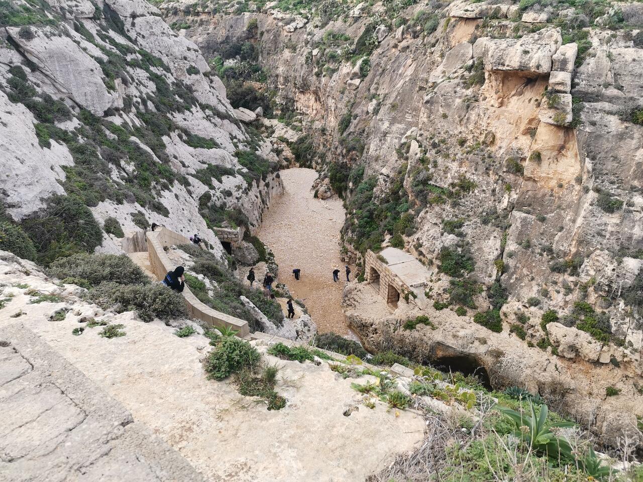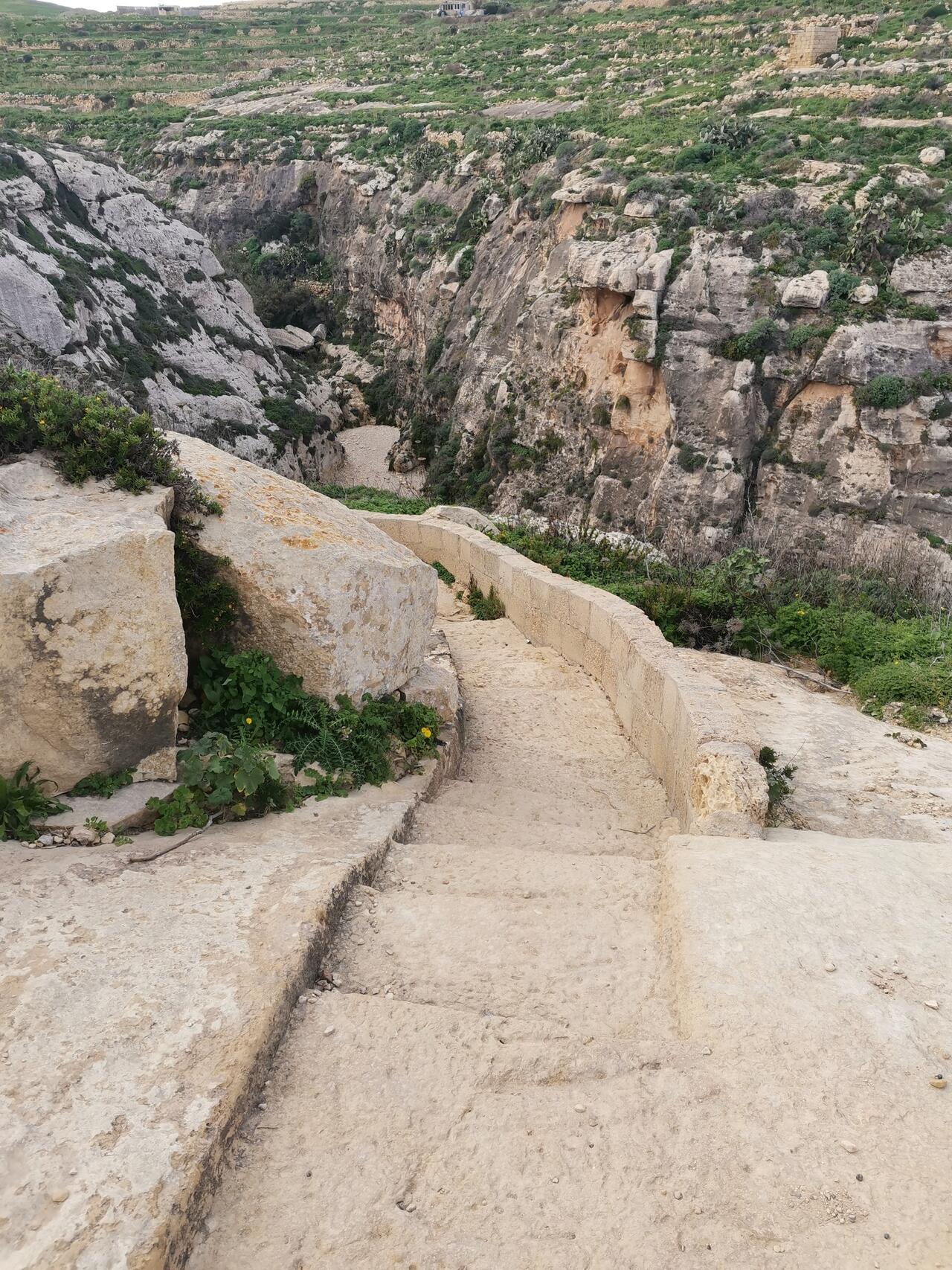 В отличие от Ущелья в Migra il-Ferha на острове Мальта, где тропа более сложная и лестница находится в существенно худшем состоянии, это место более туристическое, и здесь спуск по лестнице в ущелье не вызывает вообще никаких проблем. Кстати, титанический объем работ по рубке лестничных ступеней (в Migra il-Ferha придавалась лишь форма природной осыпи, ступени порой получались такими, что надо иметь неплохую растяжку на карабкания по ним), здесь не просто рубили а, вероятно, взрывали скалу, прорубая в ней собственно тоннель, уступы для последующего вытесывания ступеней. Так что, вероятно, сия лестница – дело рук британских военных в 40-е годы, а ущелье могло использоваться либо как гавань для небольших катеров, либо для шлюпочной высадки с кораблей на сушу. Здесь же сохранились старые пакгаузы, по-видимому, обслуживающие причал.