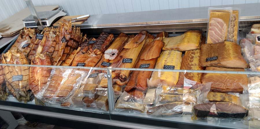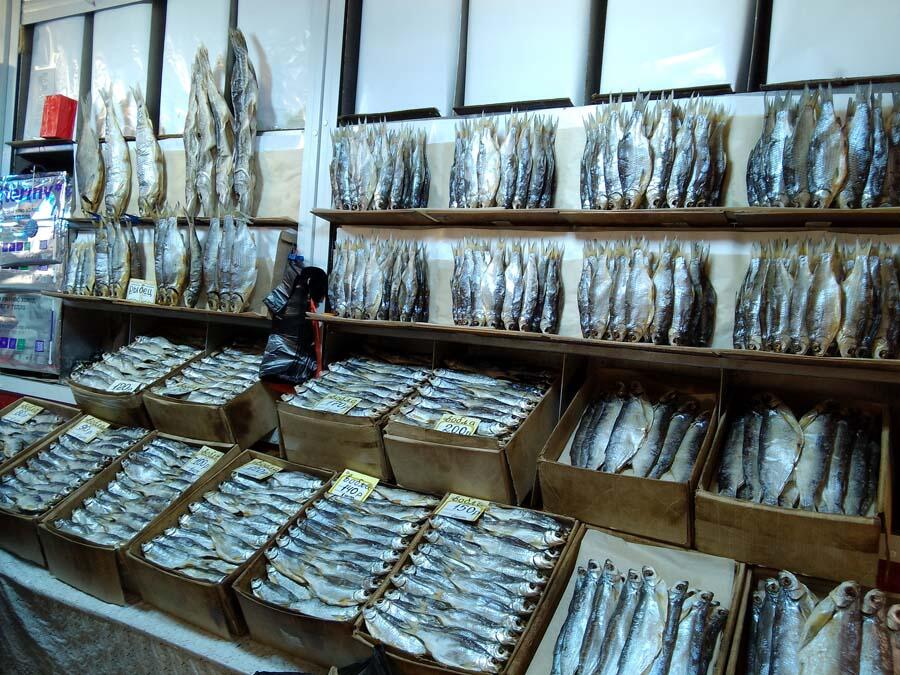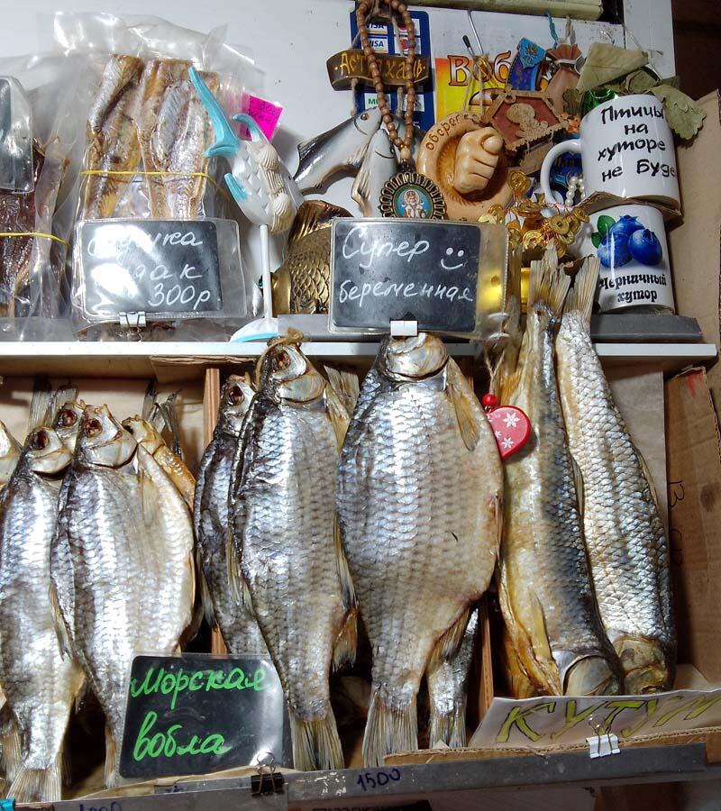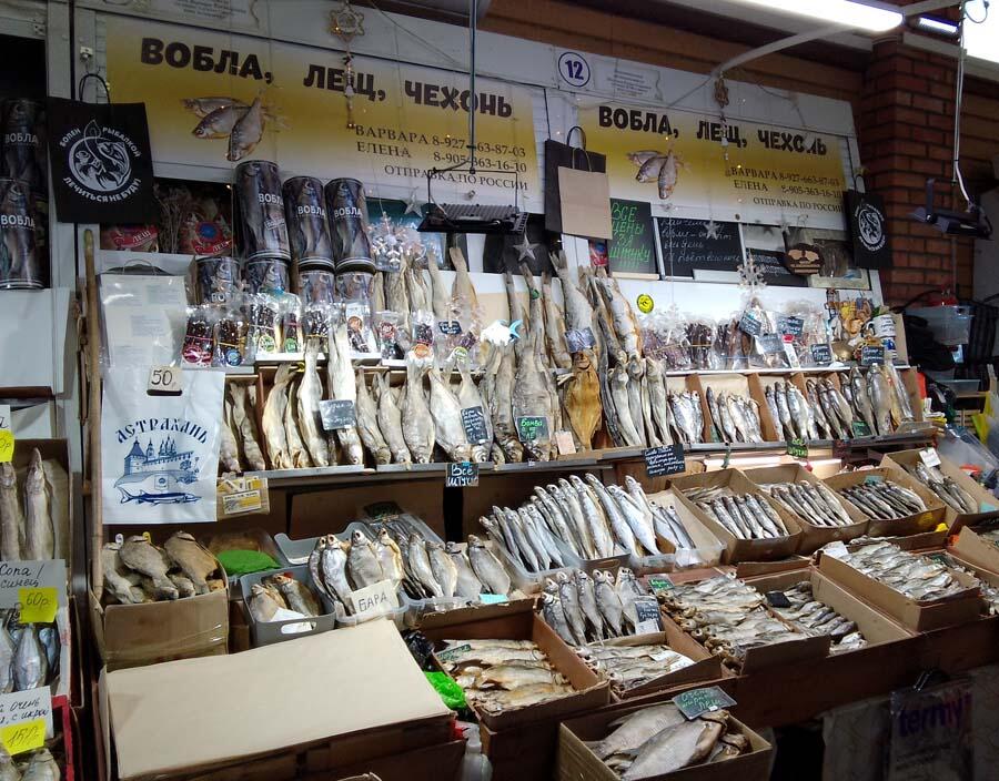 Здесь вы не увидите ассортимент рыбного магазина – минтай, селёдка, килька. Здесь - рыбы волжской дельты и северного Каспия. Глаза не верят пудовым осетрам, а дух захватывает от вида копчёных сомов, стерляди, белуги, жереха, сазана.