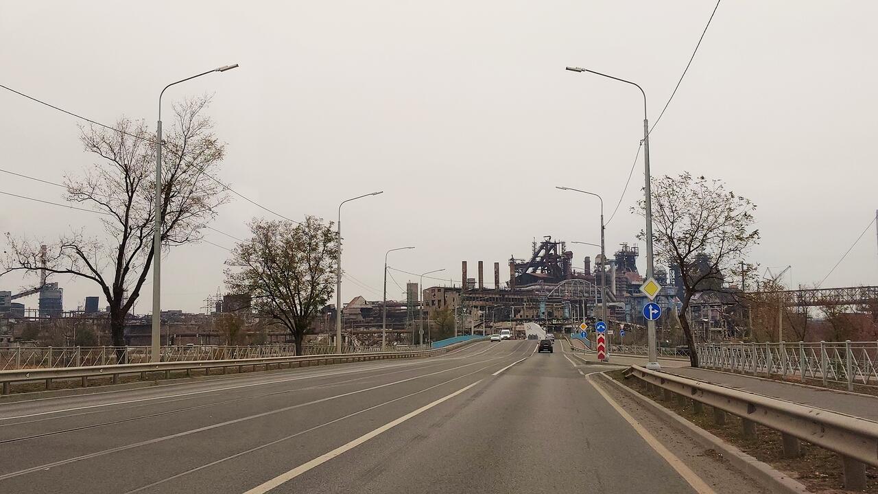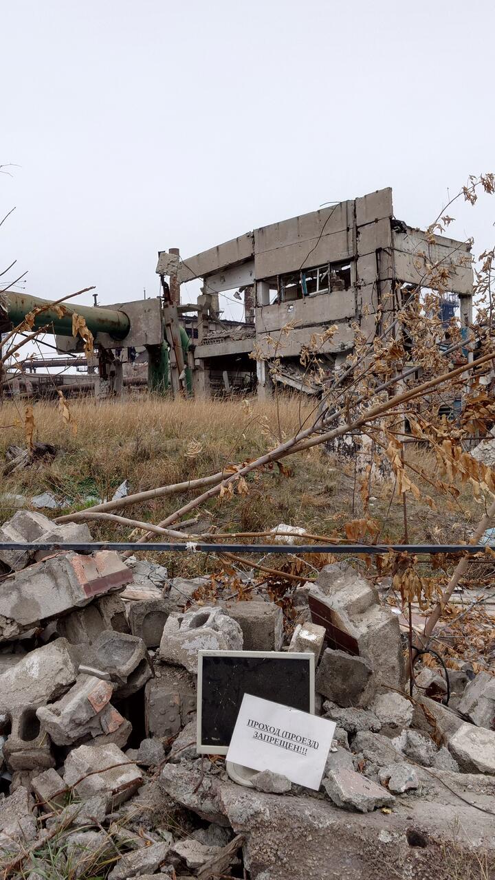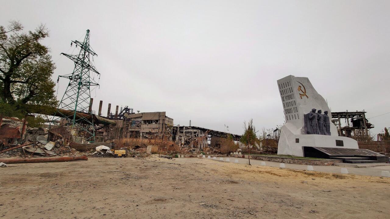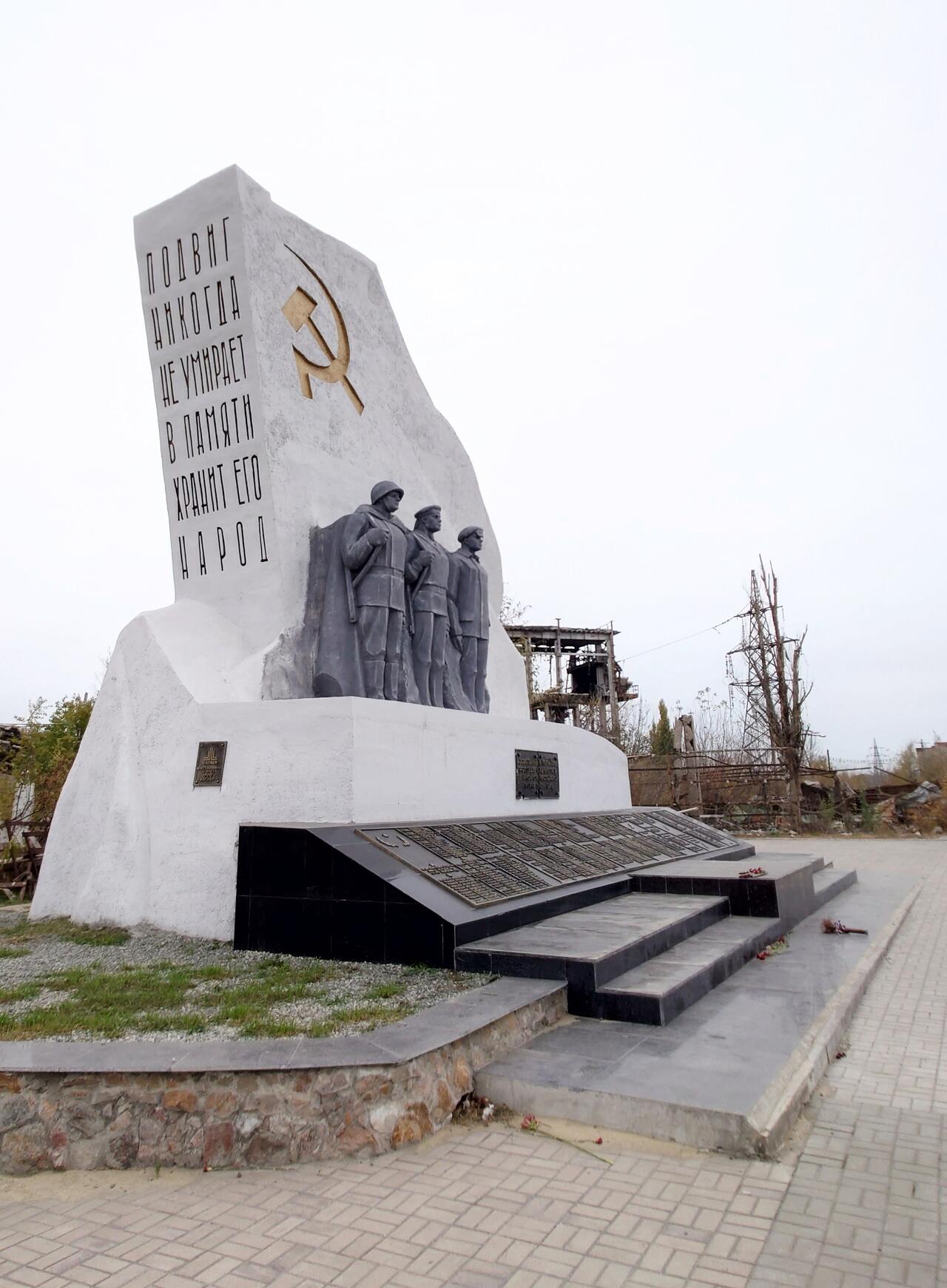 …мы не могли не приехать сюда. Поражает масштаб, поражает контраст. Руины огромной территории печально знаменитого на всю планету завода видны издалека, и времени в пути достаточно, чтобы прочувствовать колоссальную силу событий тех дней – мы спускались по улице Шмидта, по мосту через реку Кальмиус. Подъехав вплотную, оказались «лицом к лицу» с совершенно нетронутом следами ожесточённых боевых действий мемориалом. Большой памятник будто пахнет ещё свежей краской! Как такое может быть? Позади километры руин, чёрные трубы остановившегося навеки завода, горы перемолотого кирпича с торчащей арматурой, рваные рельсы, на них ржавеют не разгруженные думпкары. И он. Белый, чистый, гордый. Несмотря на пасмурность, кажется, что сияет.