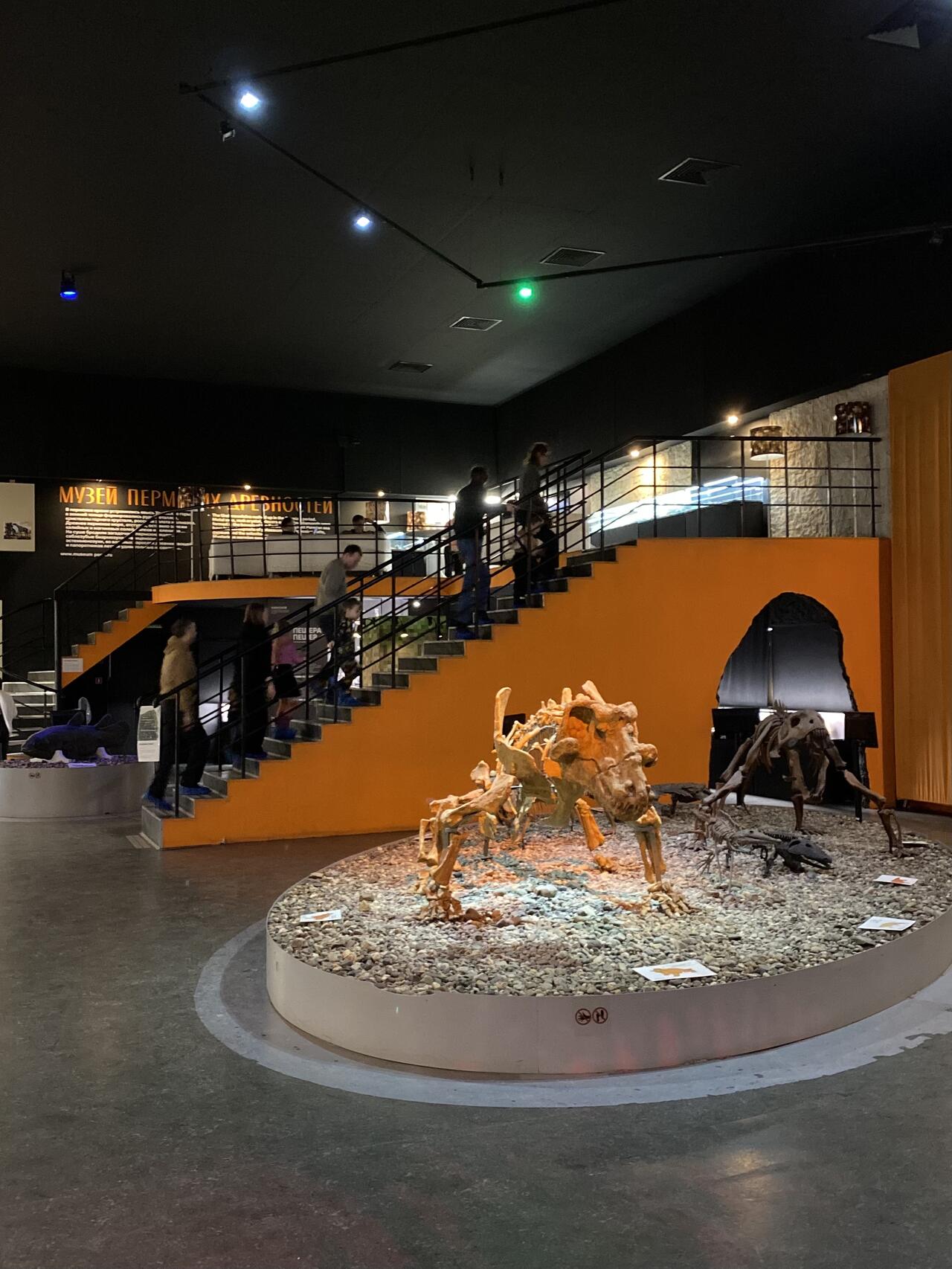 На подиумах мы можем увидеть скелет эстемменозуха уральского, слепки пермской амфибии камакопса и платиопозавра, скелет диметродона, кистеперую рыбу латимерию, хищного динозавра тарбозавра и травоядного утконосого динозавра циньтоозавра, яйца динозавров, первоптицу и дейониха, амфибии, ископаемую костную рыбу, черепаху, кости скелета носорога и многое, многое, другое…