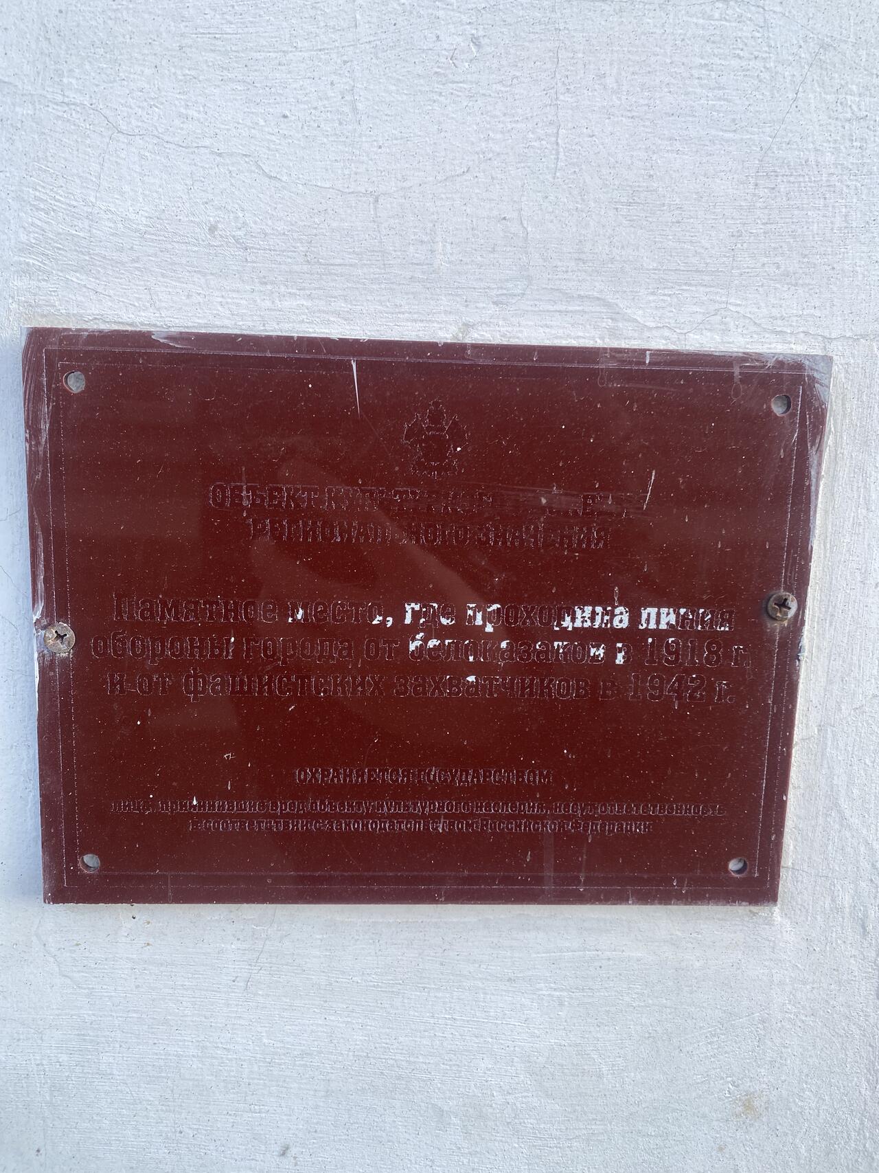 Здесь же возле обелиска стоит еще одна табличка, сообщающая путнику не только о событиях Великой Отечественной, но и о еще более ранних: «Памятное место, где проходила линия обороны города от белоказаков в 1918 году и от фашистских захватчиков в 1942 году. В 1918 году здесь проходила линия обороны г.Армавира от белоказаков. Оборона была организована городским военно-революционным комитетом. Здесь же в августе 1942 года 375-ый отдельный зенитно-артиллерийский дивизион 10 дней сдерживал наступающего врага.».