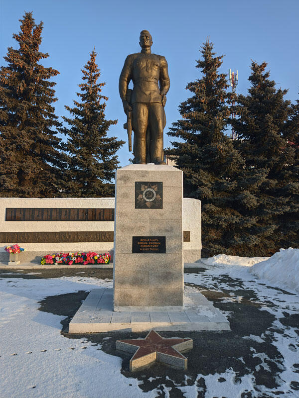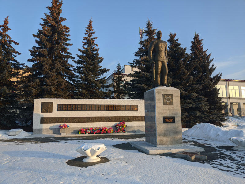 Этот памятник виден со всех сторон села и даже с сибирского тракта. Высота памятника вместе с постаментом составляет около шести метров.