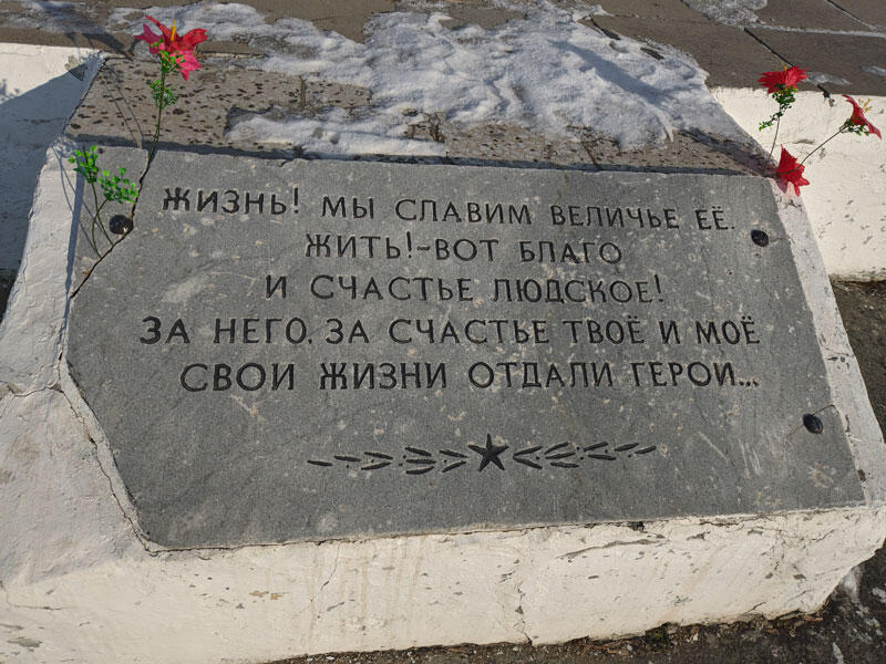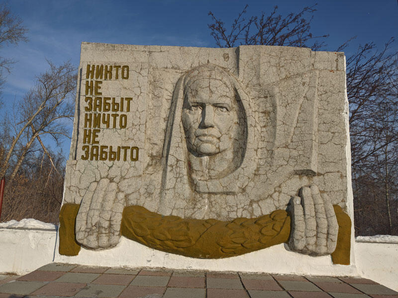Мемориал, посвященный жертвам второй мировой войны. Женщина держит в руках лавровый венок – символ славы и победы. Внизу на табличке надпись «Жизнь! Мы славим величье ее… Жить! Во благо! И счастье людское! За него, за счастье твое и мое свои жизни отдали герои». Слева, рядом с лицом женщины надпись «никто не забыт, ничто не забыто».