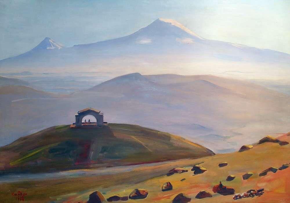 первый план — панорама, раскрывающая с дороги. Отсюда виден каскад лестниц, ведущих к арке, но Арарата не видно, и назначение сооружения остаётся неизвестным.