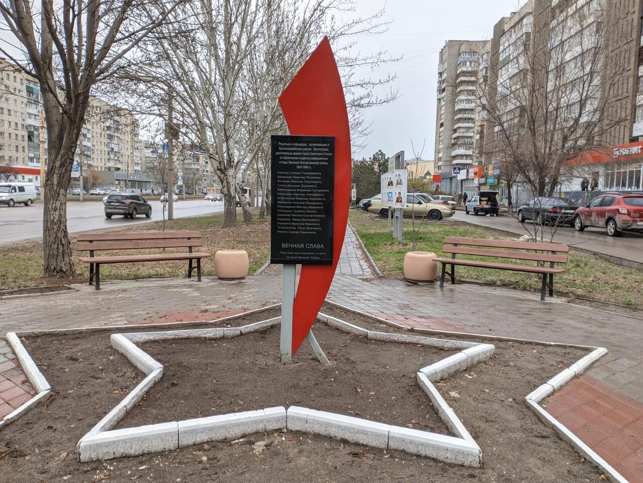 На стендах, установленных на Аллее, размещены фотоматериалы о жителях Красноармейского района Волгограда – ветеранах и участниках войн истории Российской Федерации. К 70-летию Великой Победы на Аллее Защитников Отечества была оформлена клумба «Звезда» и установлен памятный знак Героям Советского Союза. Знак представляет собой небольшую изогнутую стелу, к которой прикреплена памятная доска из черного мрамора. На доске высечены имена и фамилии пятнадцати Героев Советского Союза, оборонявших южные окраины города в годы Великой Отечественной войны. В 2021 году была проведена реконструкция, обновление и благоустройство Аллеи Защитников Отечества.
