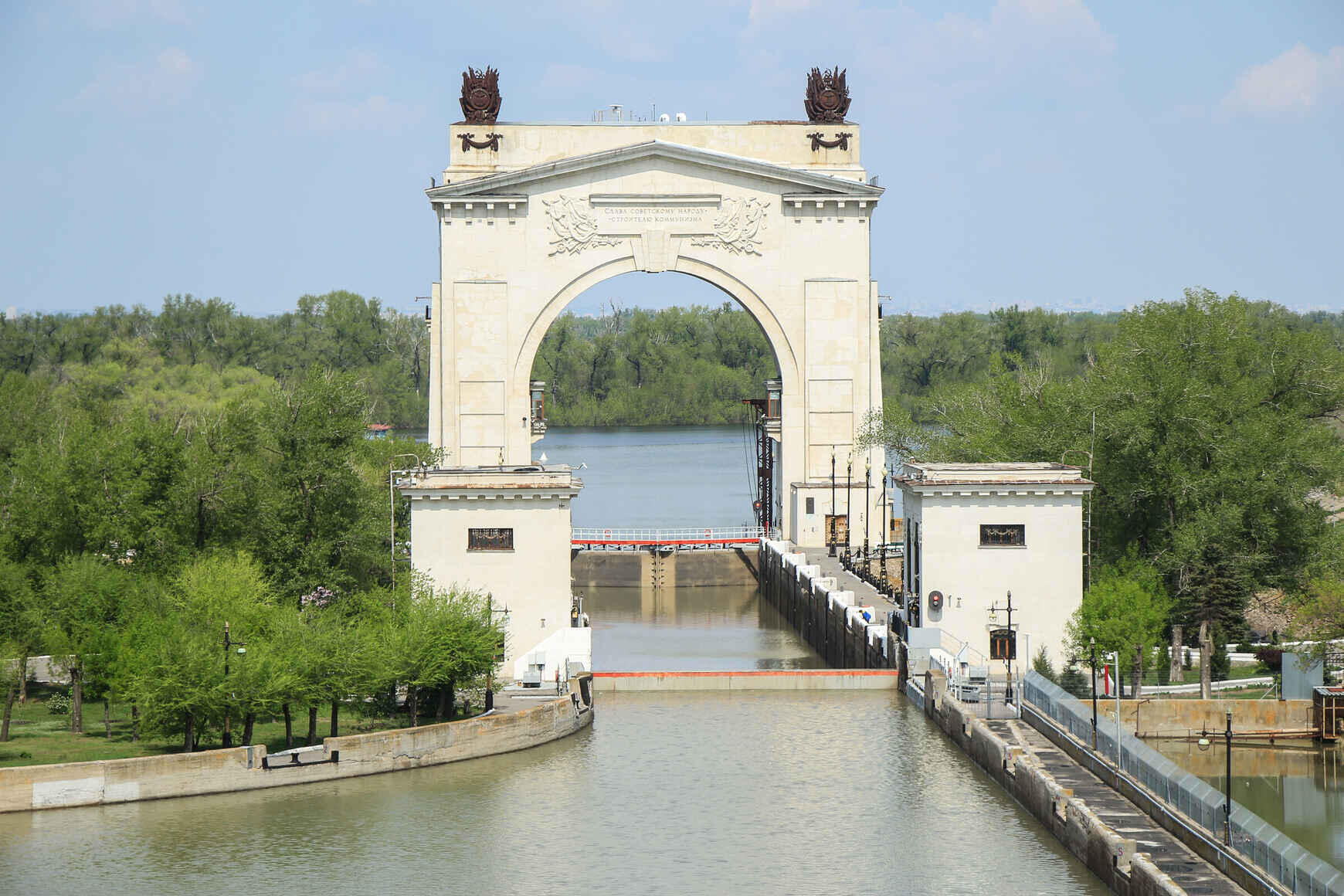 Триумфальная арка - ворота первого шлюза располагается в черте города и открывает список памятников Волго-Дона. Грандиозное сооружение возвышается над каналом на 40 метров, подчеркивает важность и масштабность проекта. Выполненная по образцам классических древнеримских арок, она славит не победу воинов, а советский народ. На самом верху конструкции установлены знамена, украшенные серпом и молотом, якорями и звездами.