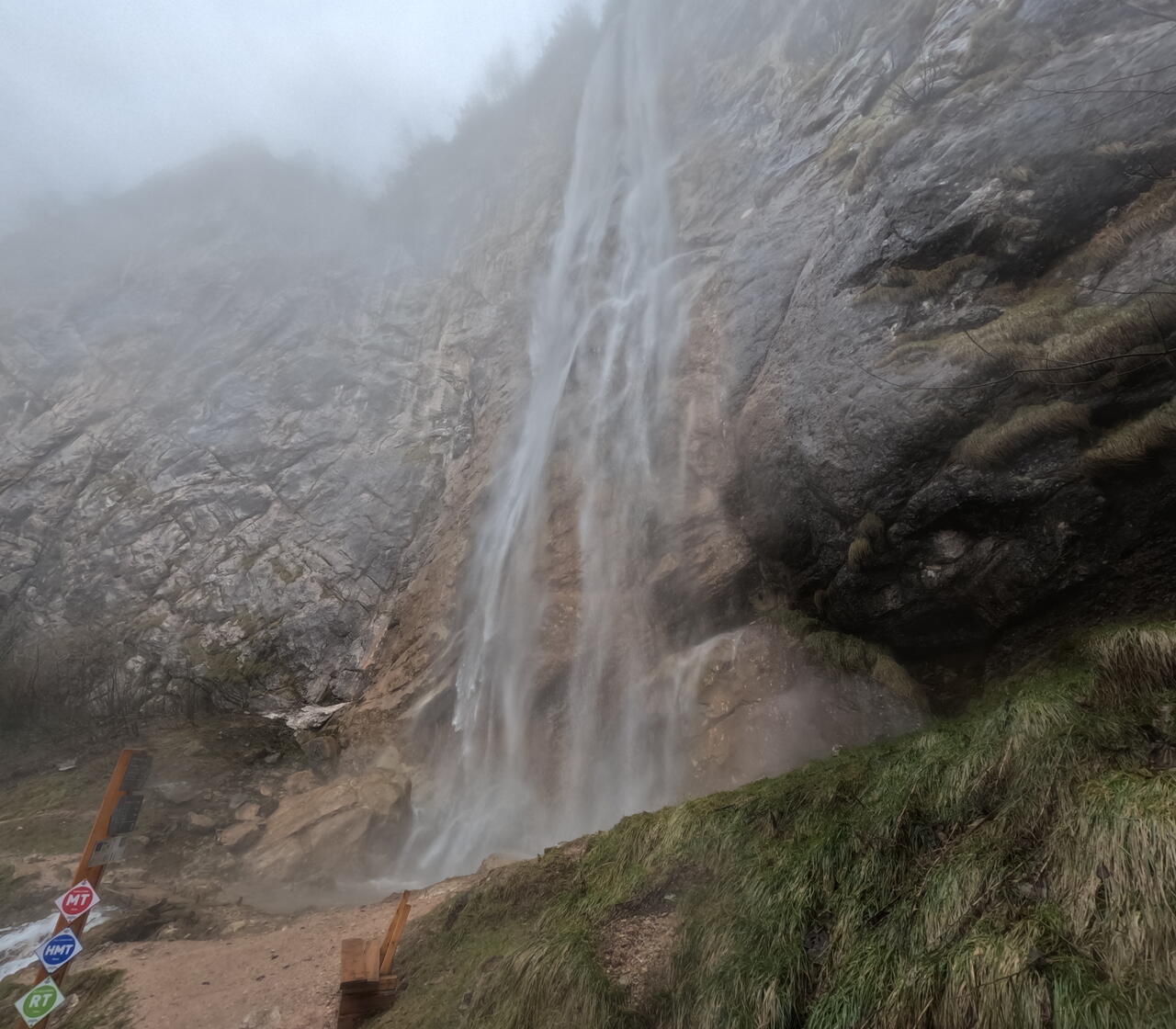 Нам повезло, мы приехали в тот момент, когда уже три дня шел дождь, и водопад был даже опасен. Простой мостик для перехода ручейка теперь представлял собой скользкую доску без перил над бурлящим потоком. Мало того, падающая с высоты вода усиливает и воздушный поток, образуя ветер, сдувающий вниз. Поэтому в дождь берите правильную обувь и/или палки.