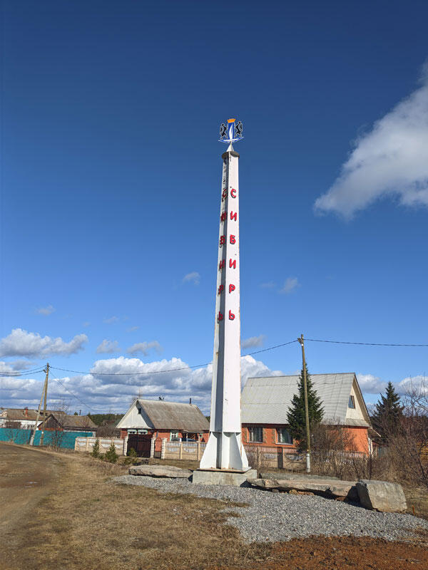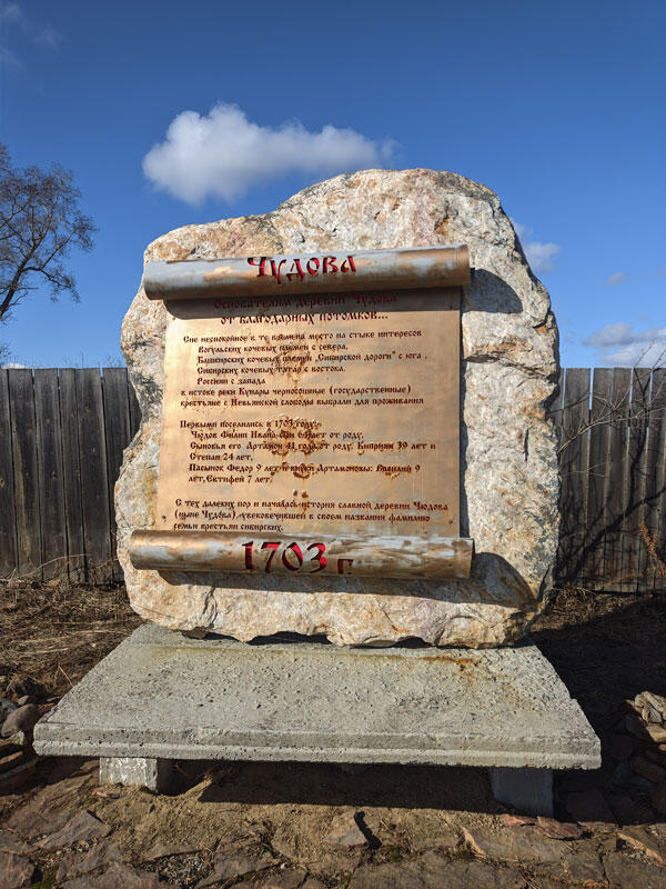 Сразу поражают размеры музея: он начинается не за воротами, а перед ними, на центральной площади деревни. Здесь стоит стела, утверждающая, что именно здесь, в Чудове, и находится граница Урала и Сибири. Напротив ворот — памятник-свиток, рассказывающий нам о первых жителях с фамилией Чудов, пришедших сюда в 1703 году.