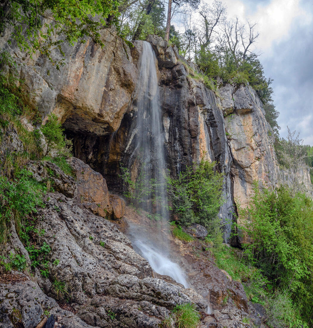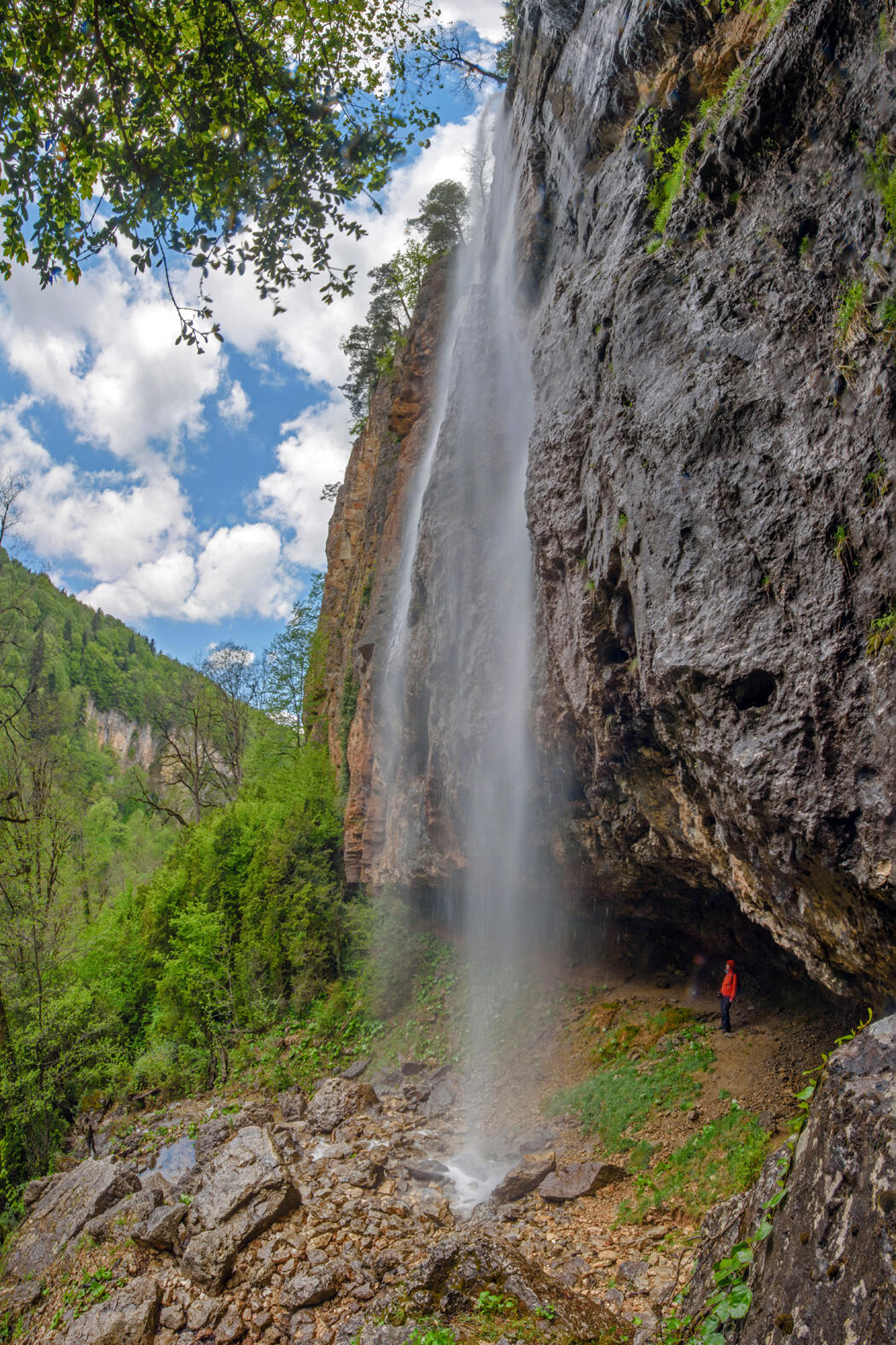 Так образуется у Пальмового водопада его нижний каскад. Пульсирующая, трепещущая под дуновением даже слабого ветерка, его водная завеса, похожая то на ливневый дождь, то на каскад миллиарда брызг выглядит хрупко и необычайно красиво. Ниже водопада Пальмовый ручей все-таки выходит на поверхность, где его русло, вплоть до впадения в Курджипс, охраняет армия сказочных самшитов.