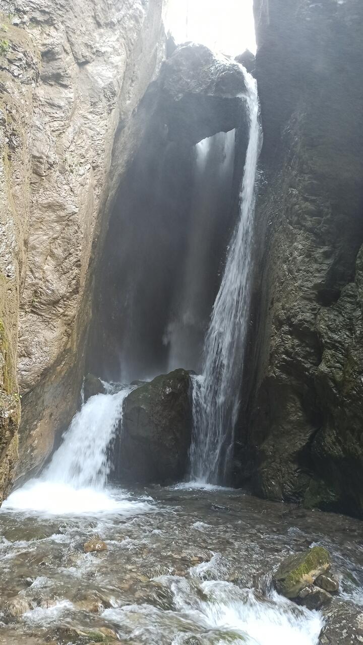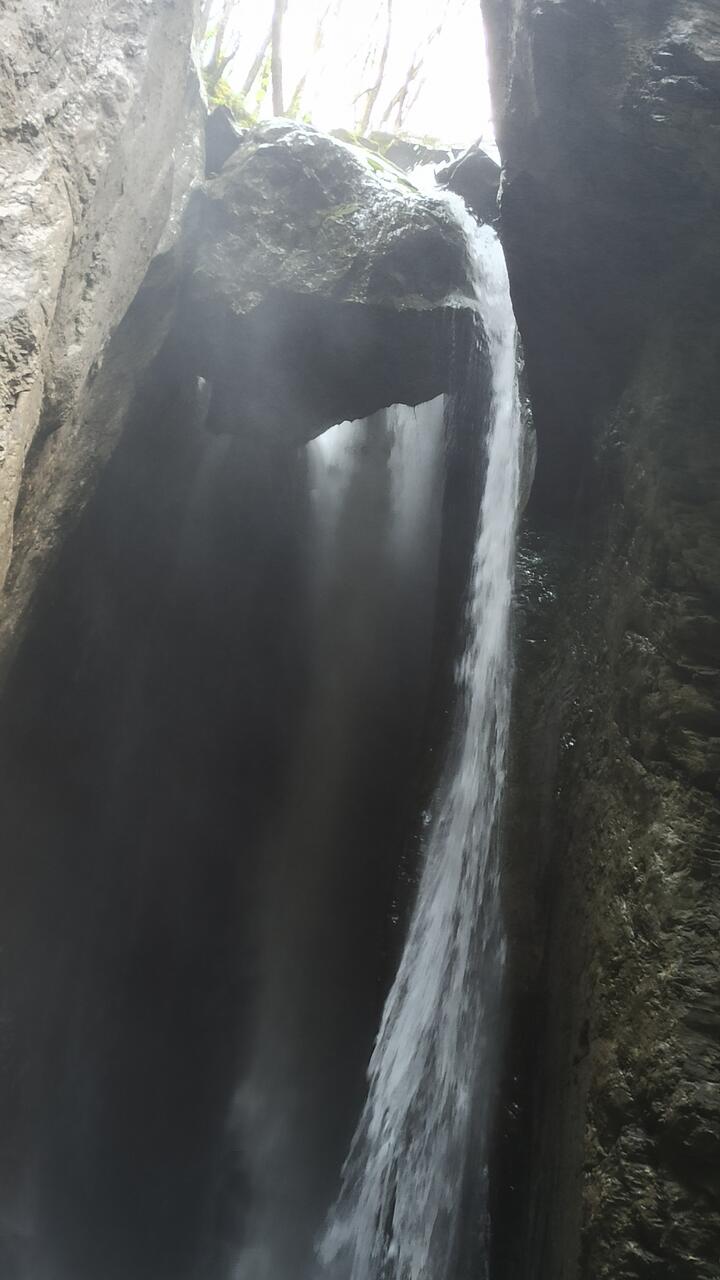 Небошая речка Растушка, впадающая чуть ниже в бурную Радику, размыла и отколока кусок скалы, который затрял между стенками узкого ущелья. И теперь вода льется на этот камень сверху и уже с камня падает вниз. Скоро, через несколько сотен лет (или чуть раньше) и этот камень размоется и упадет вниз. Тогда конфигурация водопада изменится.