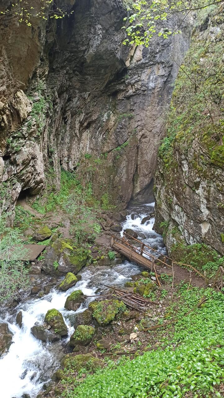 Далее река стремится к еще более узкому ущелью, и в точке, где вы подходите к потоку, как раз стекает быстрой струей вниз. Не подходите, может унести.