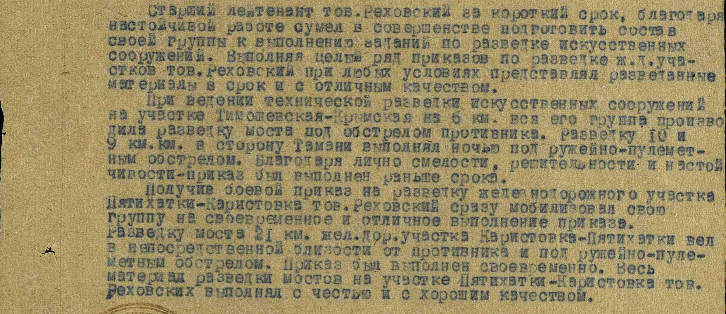 В годы войны Ю.Д. Реховский (в РККА был призван в 1940 году) служил в инженерной разведке железнодорожных войск. В первый период войны его взвод под огнем наступающих сил противника занимался технической разведкой искусственных сооружений на Кубани, минированием и уничтожением ж/д путей и складов с горючим, боеприпасами и продовольствием для того, чтобы всё это не досталось немецким захватчикам в результате отступления советских войск. После переломных сражений зимы 1943 года, когда требовалось обеспечить скорое и бесперебойное наступление наших армий, дедушка, командуя уже ротой инженерной разведки, выявлял железнодорожные сооружения, подлежащие восстановлению. Его солдаты и офицеры проводили ремонтные работы путей и мостовых сооружений, давая таким образом возможность советских эшелонам продвигаться затем вперед самым быстрым темпом. В 1945 году Ю.Д.Реховский был передислоцирован с Кавказа в Ленинград, где в составе восстановительных отрядов работал над прокладкой ж/д путей Тихвинского направления для обеспечения города продовольствием после блокады и возвращения эвакуированных жителей.