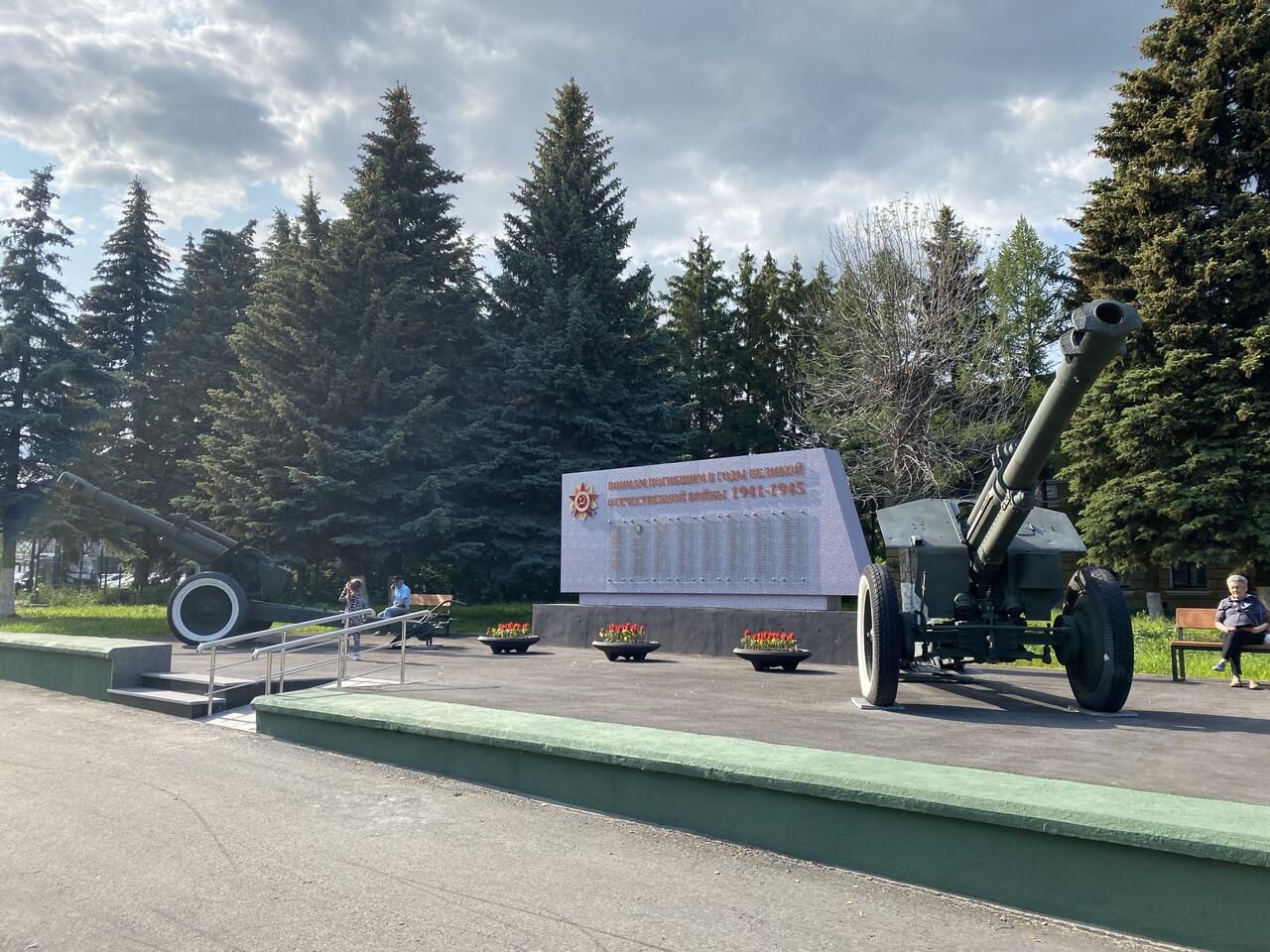 Рядом с памятным знаком расположены 2 гаубицы. Одна раньше стояла на территории завода, другая - около музея ЗИФ.