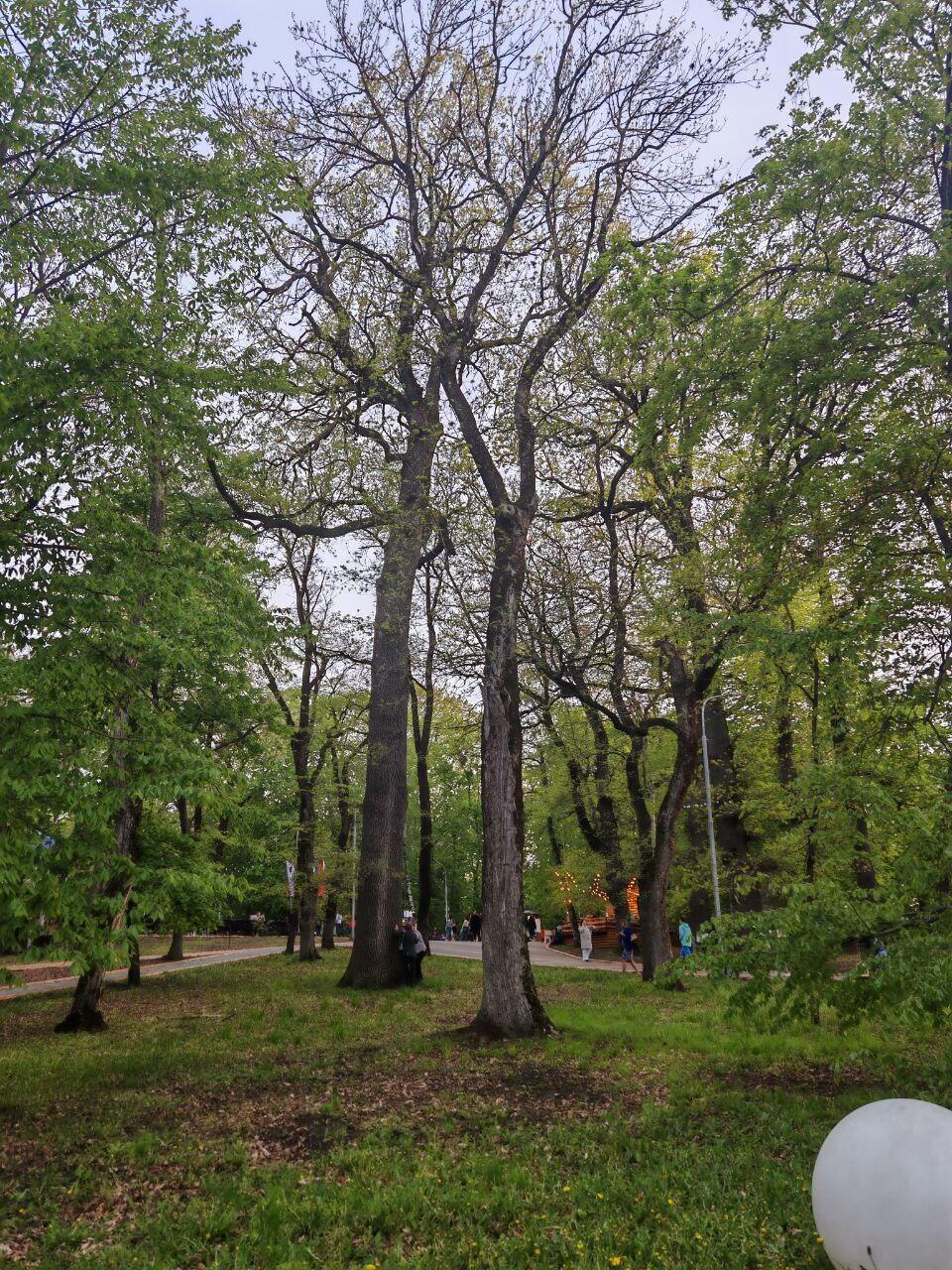 Первым владельцем парка был поручик Матвей Бабин. Он проложил парковую аллею и ряд боковых дорожек, с помощью чего превратил лесной массив в рощу. А уже в 1848 году князь Воронцов-Дашков поручил внести изменения и роща стала городским садом. В честь великих писателей нашей страны в парке названы деревья. Связано это с тем, что в свое время они гуляли по нему и восхищались красотойой след оставили А.С. Пушкин, М.Ю. Лермонтов, А.С. Грибоедов. «Дуб Ермолова» располагается у мостика, а остальные три дерева на острове.