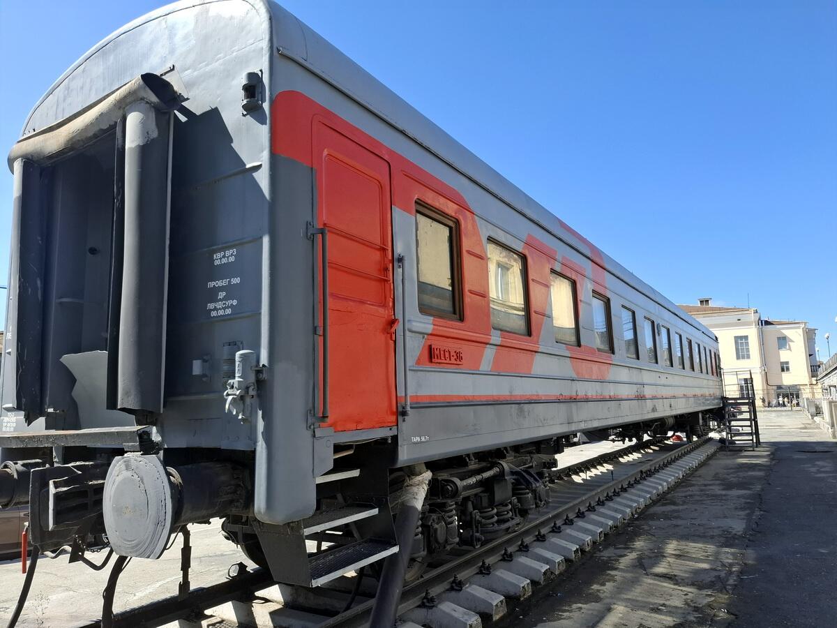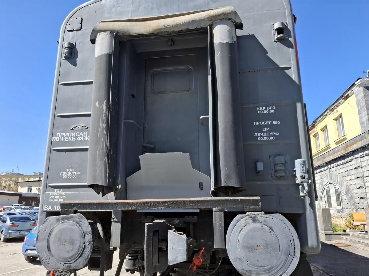 Такой вагон установлен у железнодорожного вокзала Екатеринбурга. К сожалению, чтобы посмотреть его внутреннее убранство, придется поступить на курсы проводников, так как этот вагон используется в качестве учебного пособия.