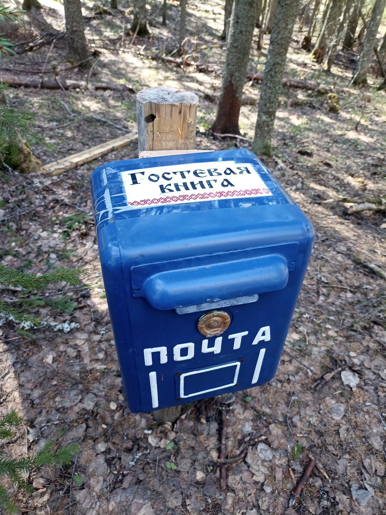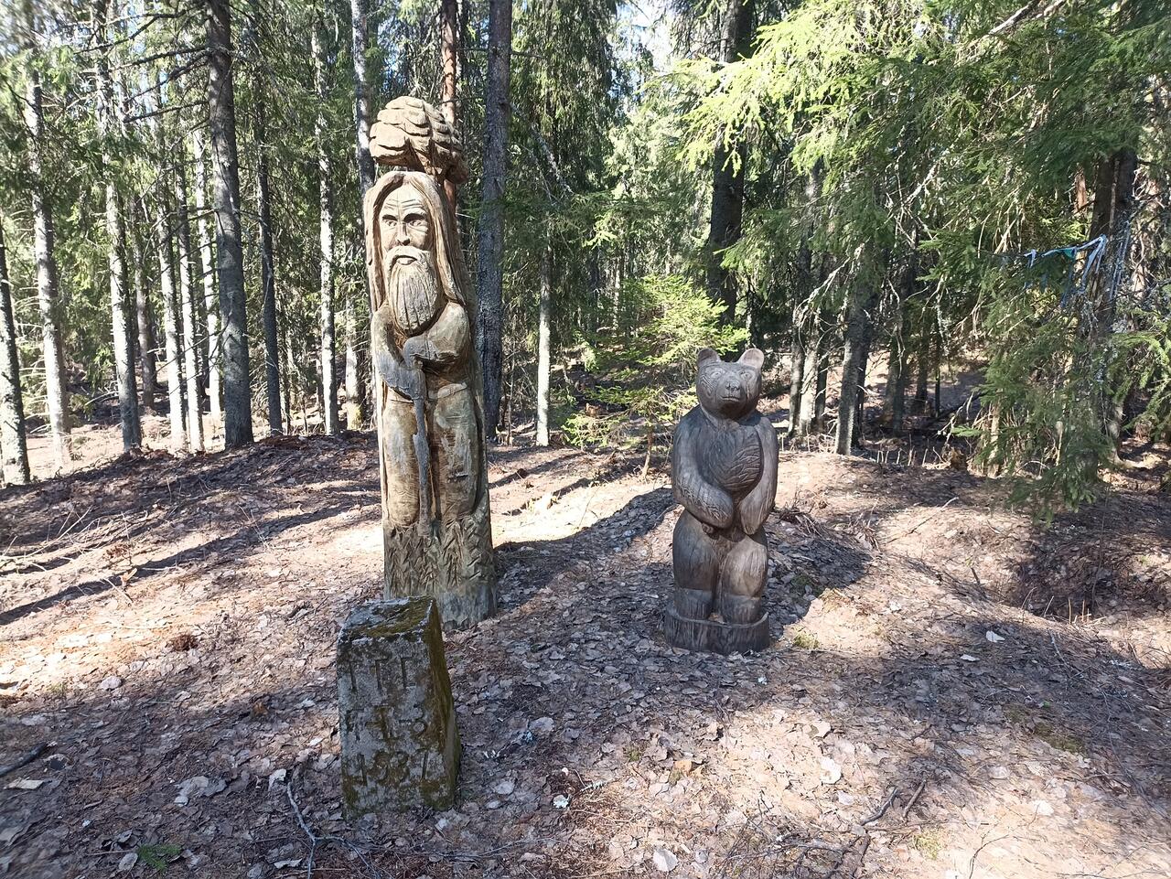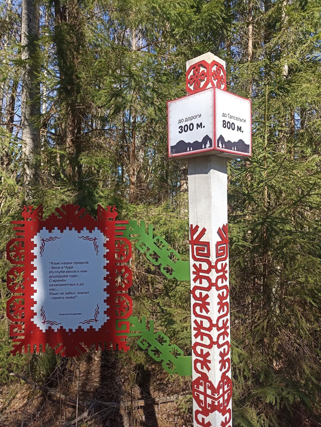 До вершины придется добираться пешком, но сложности тут тоже нет никакой. В точке N 60 28.998 E 35 11.447 через дорогу перекинут мостик и начинается тропа. От дороги до вершины горы придется пройти 1100 м и набрать порядка 50 м по высоте. Сейчас (в мае 2025 года), видно, что ведутся активные работы по созданию очередной экологической тропы. Причем не обычной, а с явно этнографическим уклоном! Через каждые сто метров установлены столбики-указатели. Но это не обычные столбики с цифрами – почти каждого есть некий старинный предмет – грабли, косы, чугунки, живоловки и пр. – использующиеся в обиходе проживавших в этих местах вепсов. Ещё на каждом столбике висят таблички с стихами и украшены они традиционными вепсским орнаментом. На деревьях между столбами, прикреплены метки-указатели, в виде бубнового туза. Так что заблудиться там невозможно. Заготовлены доски для постройки мостков через небольшой заболоченный участок, думаю вскоре мостки тут соорудят.