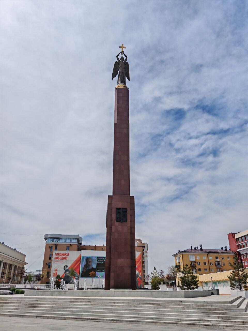 Монумент представляет собой колону, облицованную красным гранитом, высотой 25 метров, которую венчает Ангел, отлитый из бронзы, опирающийся одной ногой на позолоченную полусферу. Ангел обращен на восток и возвышает крест, держащий в своих руках, над городом. У подножья монумента находится фонтан, который радуют жителей города в жаркие знойные дни.