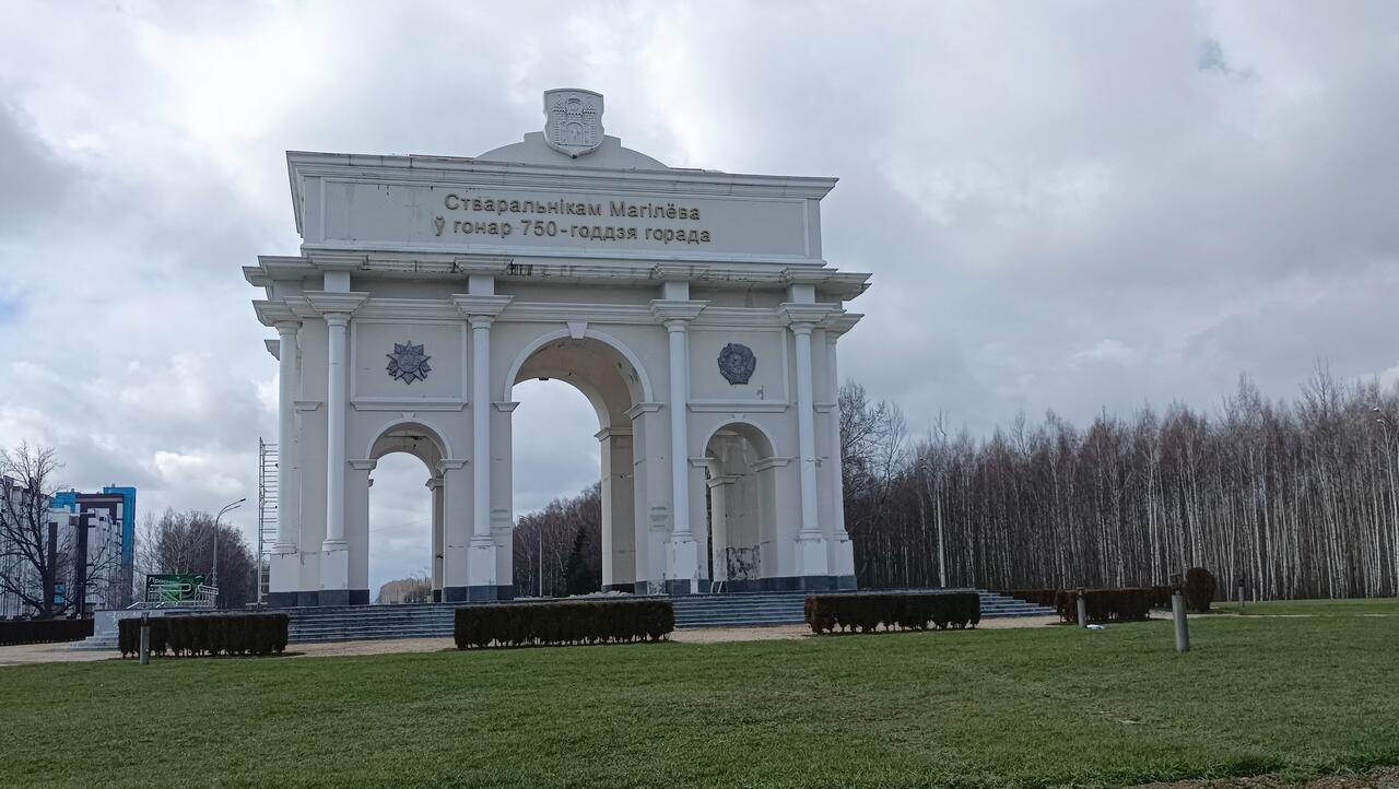 20-метровую арку украшают барельефы высоких наград, которых удостоена Могилёвская область: орден Отечественной войны І степени и орден Ленина. С обеих сторон арки размещена надпись «Стваральнікам Магілёва ў гонар 750-годдзя горада» (в переводе с белорусского — «Создателям Могилёва в честь 750-летия города»).