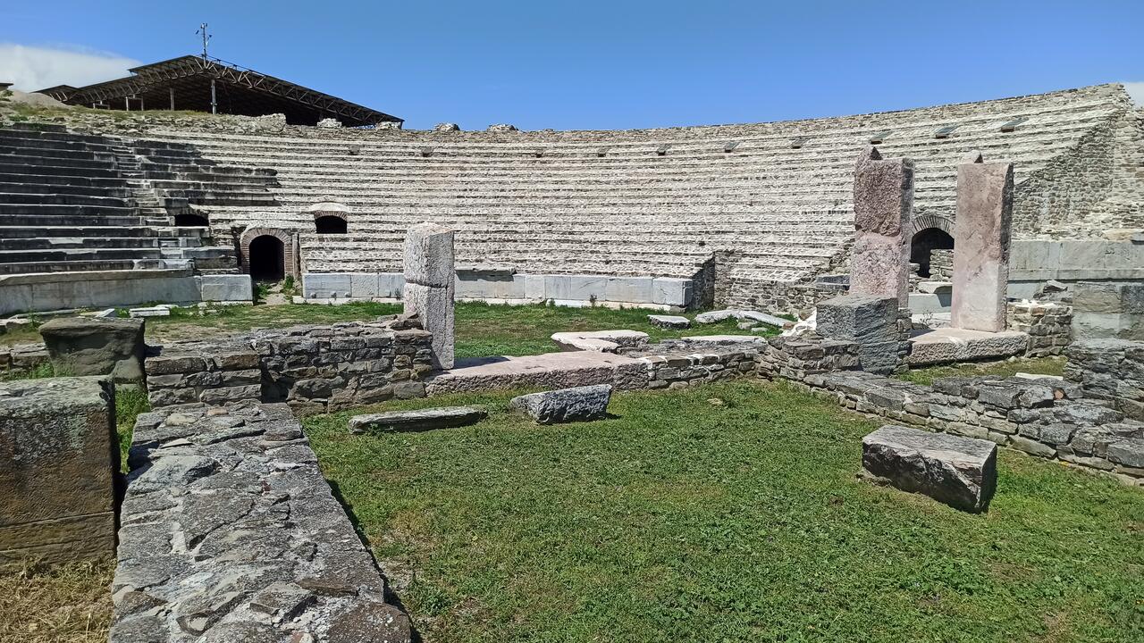 Сейчас здесь огранизован музей, одновременно с продолжающимися раскопками. Продают входные билеты. Базилика накрыта крышей, в 2025 году в амфитеатре была реставрация, и не пускали.