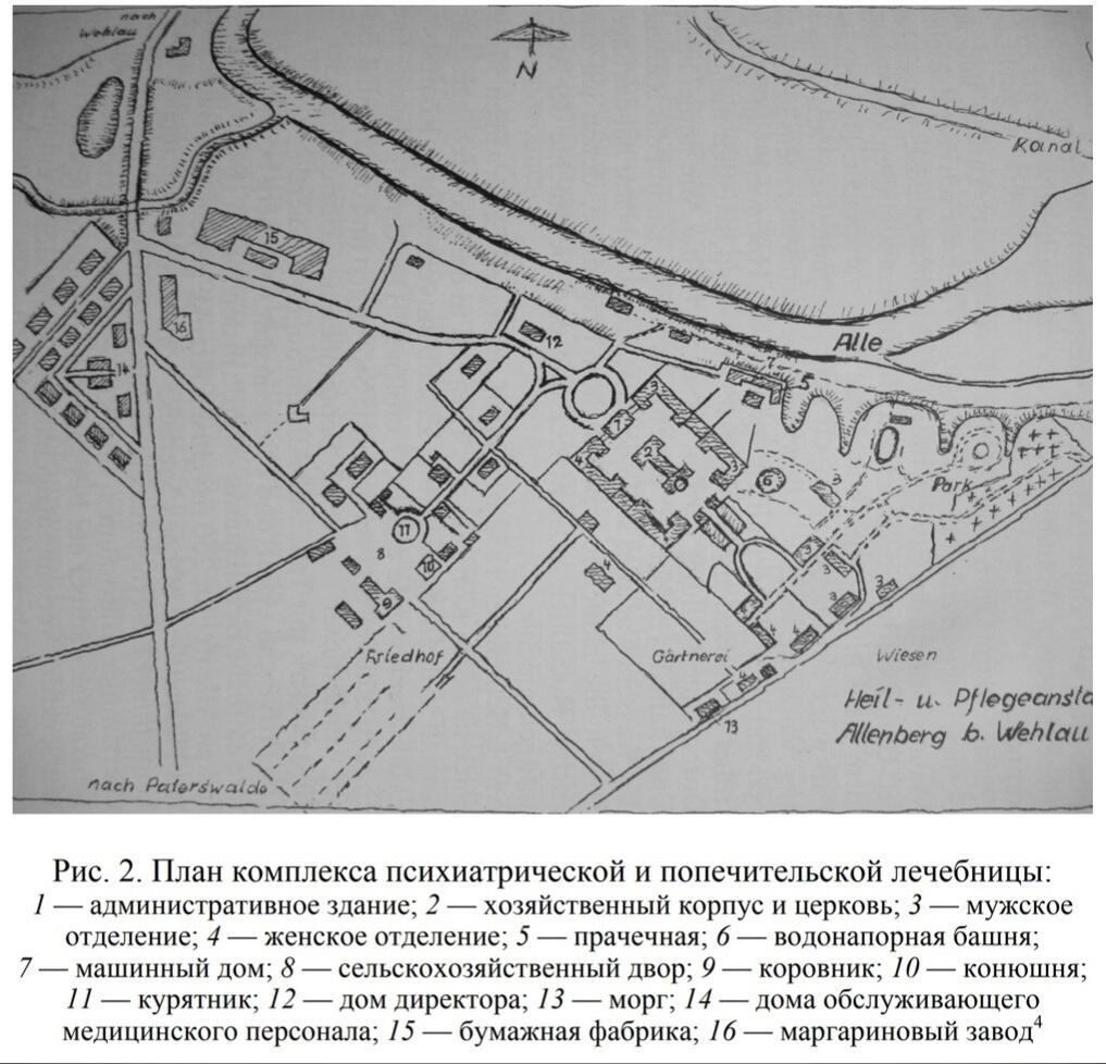 … к середине 19 века психиатрический приют столицы был переполнен пациентами и встал вопрос о необходимости нового, гораздо более вместительного. Для столицы такое соседство было нежелательно, так что место подыскали подальше… Больница Алленберг была построена за 4 года (с 1848 по 1852), на левом берегу реки Алле (нынешняя Лава), и 1 сентября 1852 года приняла первых 59 человек. В 1870 году комплекс расширился – были построены два новых корпуса отдельно для мужчин и женщин (см карту в фотографиях тайника), которые вмещали уже до 500 человек; позднее больница продолжала расширяться – места все равно хватало. К 1929 году в больнице насчитывалось уже 1400 пациентов - крупнейший комплекс на территории области. Бытовало даже выражение – “человек из Алленберга”, так говорили о странноватых личностях…