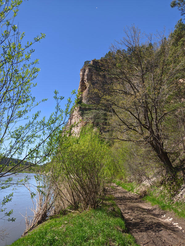 Недавно нам удалось побывать в этом живописном месте. Доехав до небольшой деревушки Ташаулово, оставили машину на её окраине и отправились пешком по грунтовой дороге вдоль реки. Через 3,5 км на правом берегу Юрюзани показалась знакомая по фильму скала Сабакай (иногда её называют Сабакайташ). Дорога проходит прямо у подножия. По большой воде её подтапливает.
