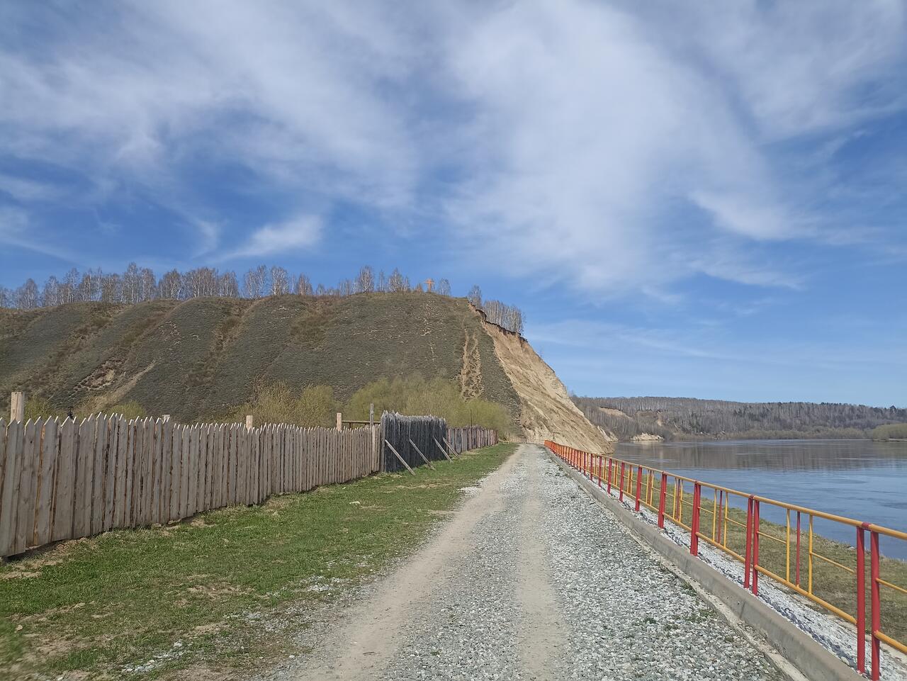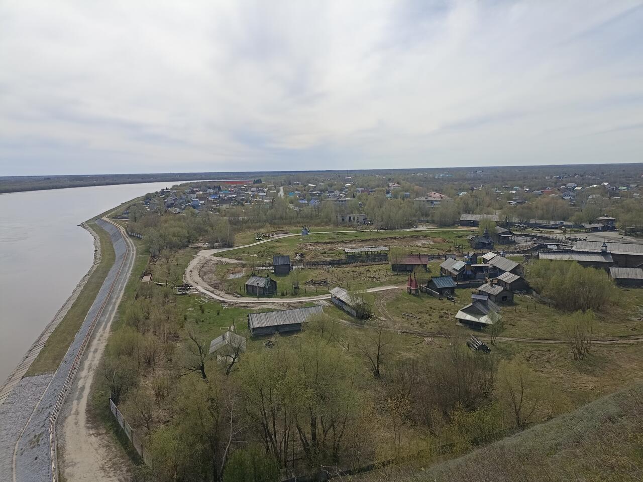 На мысу сейчас установлен большой поклонный крест. Отсюда открывается чудесный вид на долину Иртыша и расположенный у подножия берега Музейный комплекс «Посад сибирских старожилов». Нам в это комплекс попасть не удалось, так как открыт он только по субботами и воскресеньям. Но сверху все хорошо видно.