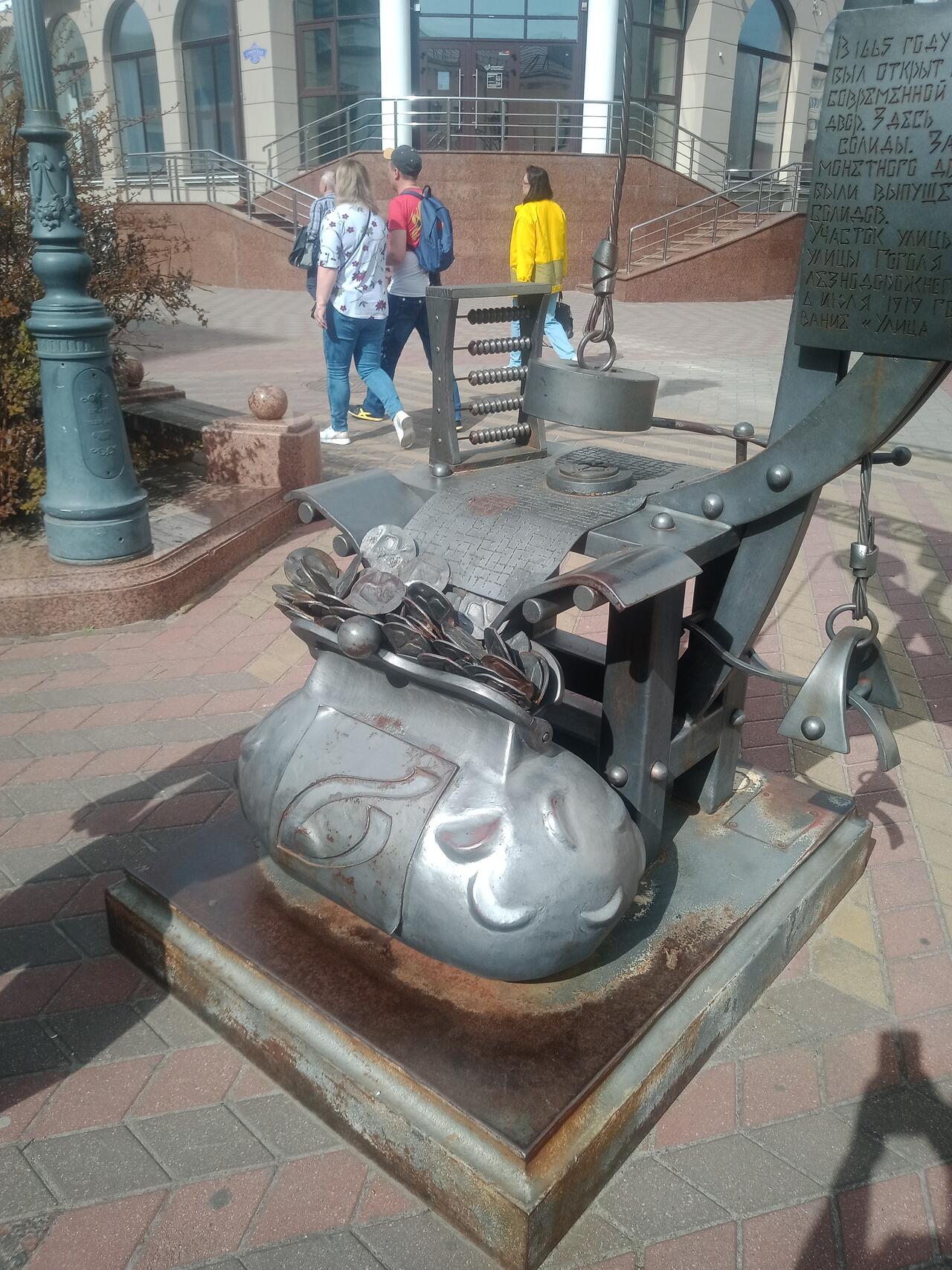 На Советской улице в Бресте стоит огромный кошелек, в который сыплются монеты. Сверху на столе - некий механизм и "калькулятор" в виде старинных счет.
