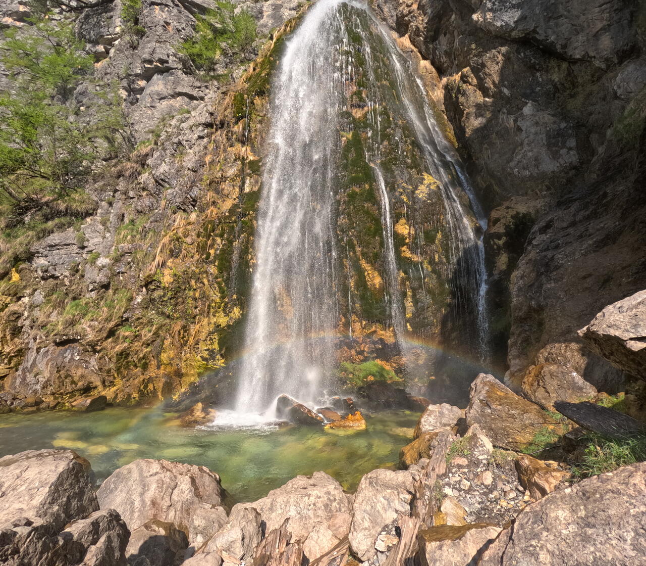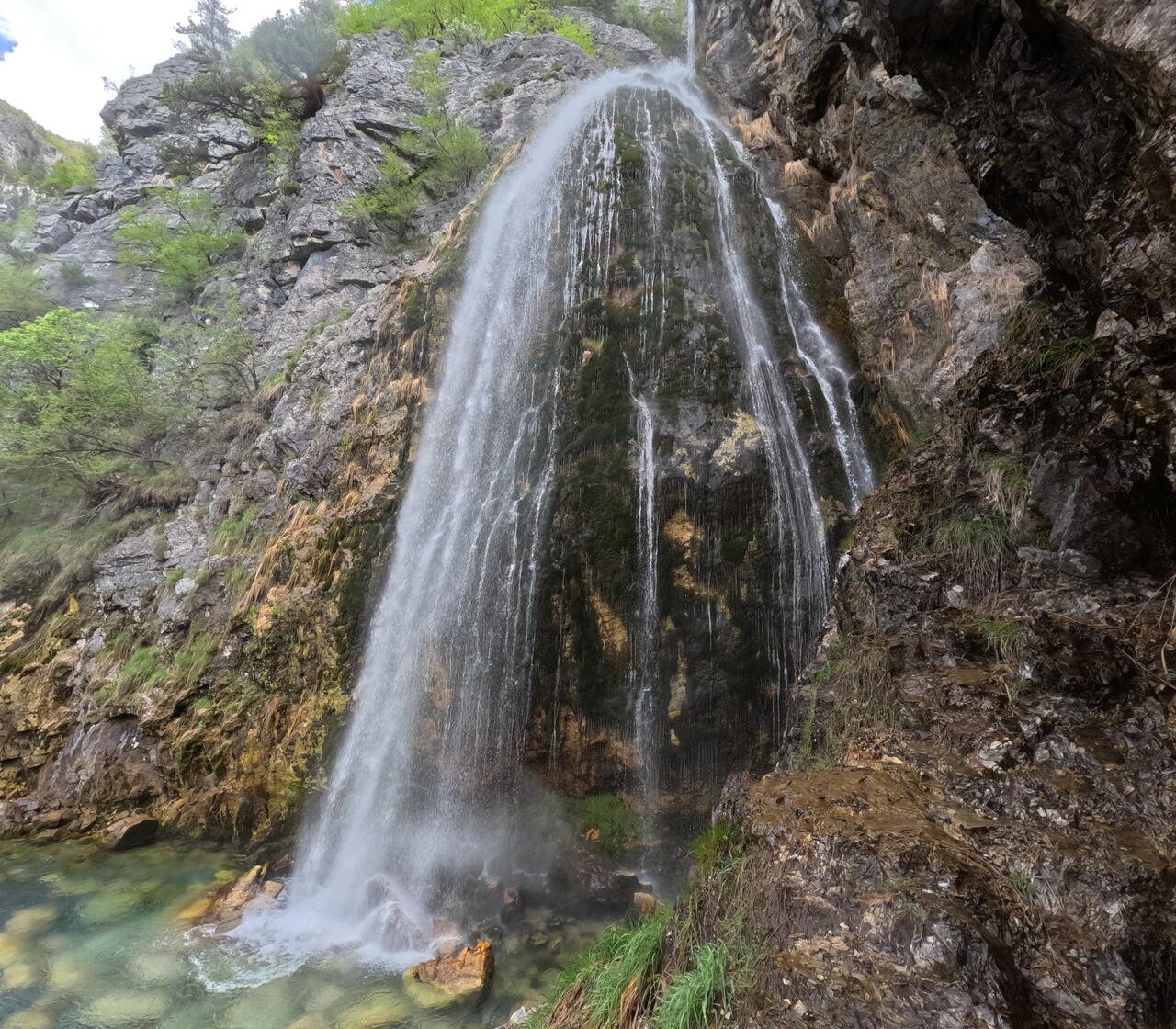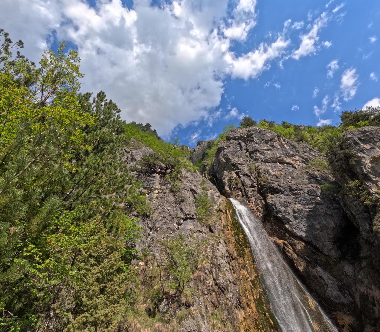 Маленькая речка, названия которой я не нашел на карте, падает с высоты более 25 метров в небольшое, кристально чистое озерцо, в котором любят купаться туристы. В весенний сезон воды много и она холодная, тогда визги купающихся перекрывают шум водопада. Речка берет свое начало на снежных вершинах Проклятых гор, которые еще зовут Албанскими Альпами.