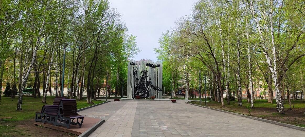 А на другом конце сквера очень необычно решенный памятник труженикам тюменского тыла. Очень похож на инсталляции Сальвадора Дали – издалека просто несколько стел с какими то значками по мере приближения сливаются в знаменитую фигуру поднимающего в атаку. Монумент с надписью «Мы победили» состоит из 27 восьмиметровых стел, символизирующих предприятия, которые в годы Великой Отечественной войны работали в Тюмени. Информация об этих предприятиях и их такой важной для фронта и победы продукции – от лыж и валенок до оружия и хлеба – расположена на боковых поверхностях стел.